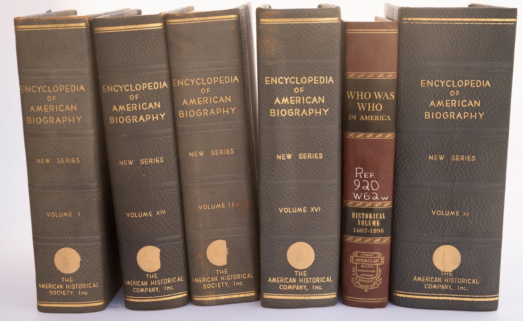 Incomplete set of volumes of the Encyclopedia of American Biography. This set includes volumes I, II, XI, XIV, & XVI. These encyclopedias were complied under the editorial direction of Winfield Scott Downs, Litt. D. & were published by the American Historical Company, Inc. in the 1940s. The volumes range between about 450 & 630 pages.10.75 x 7.5, good condition. There is also a copy of Who Was Who in America: Historical Volume 1607-1896. A component of Who's Who in American History, published in 1963. 7.25 x 10.25, good condition, 670 pages. [