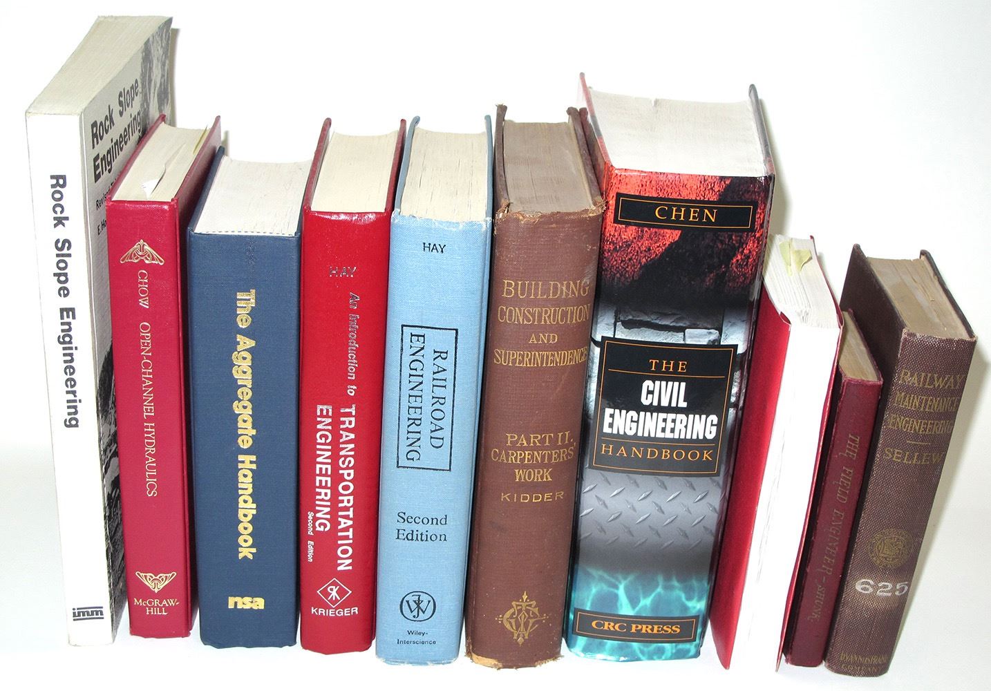 Open Channel Hydraulics by Chow, The Field Engineer by Shunk, Rock Slope Engineering by Bray, The Aggregate Handbook, An Intro to Engineering, Track Data Handbook, Railroad Engineering by Hay, Railway Maintenance Engineering by Sellew, Civil Engineering Handbook by Chen, Building Construction and Superintendence Part 2 by Kidder Date: Location: HWAC# 57206