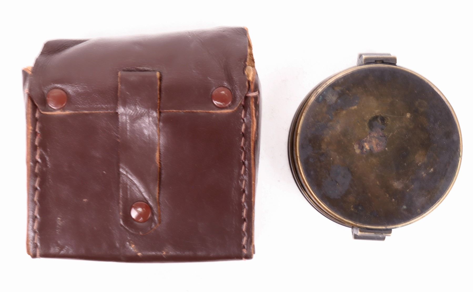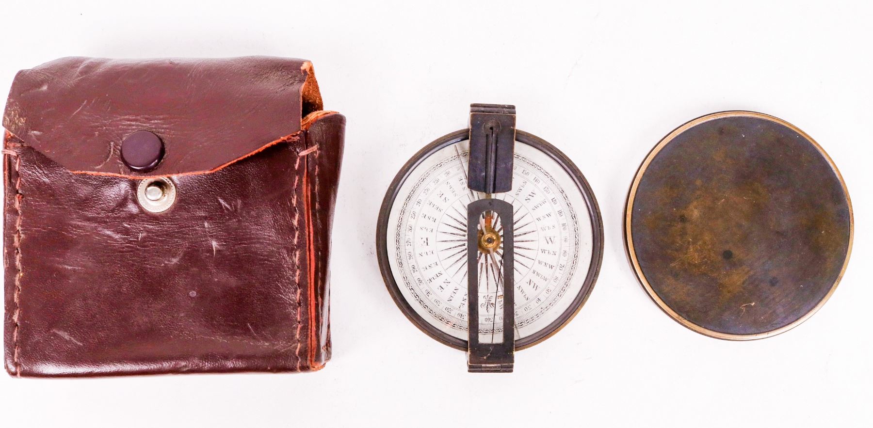 This engineering compass has its own brass and leather cases There are no names of manufacturers however the North indicator "N" with the fleur-de-lis may imply a French maker. C. 1890s. 3 in. diameter. The degree markers are also backwards. THe card is bright however curled at the outside edge and disturbing the needle. Fine construction. Please see photos for details.