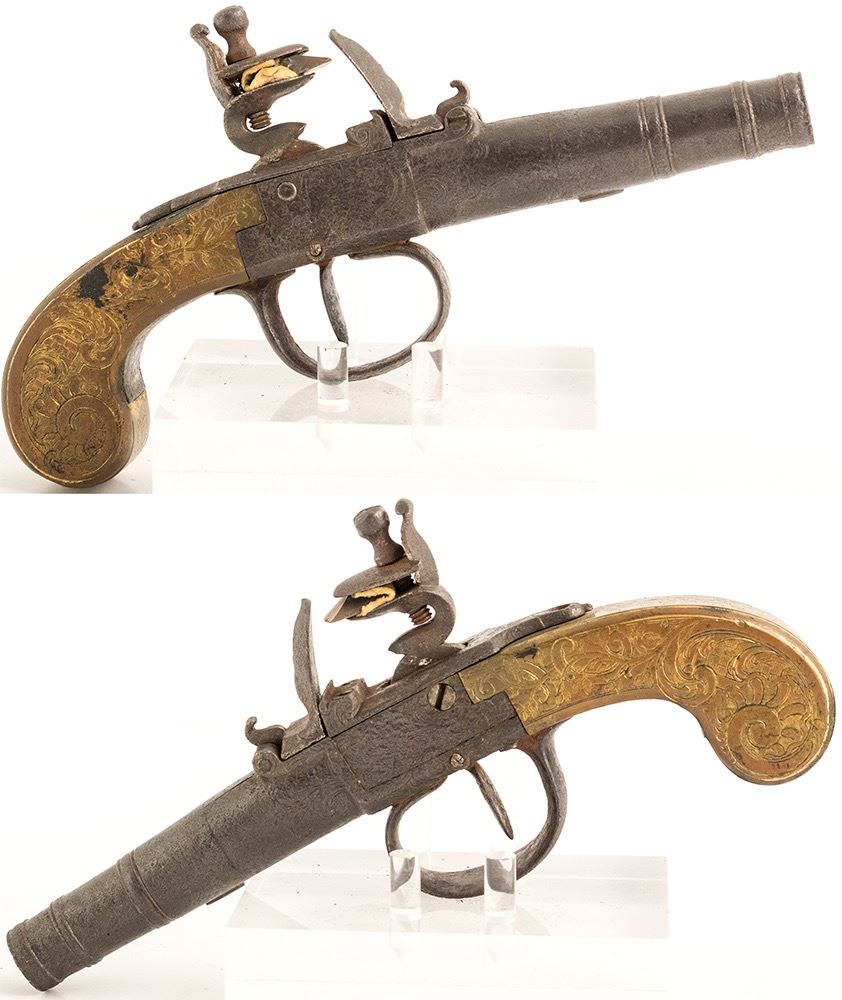 This is a .47 cal. English flintlock screw barrel pocket pistol. The barrel is cannon shaped in a steel frame and trigger-guard with brass grips; nicely engraved. This pocket pistol is 7 in. overall length c 1790's. A black powder antique. State: City: Date: ID# 49609