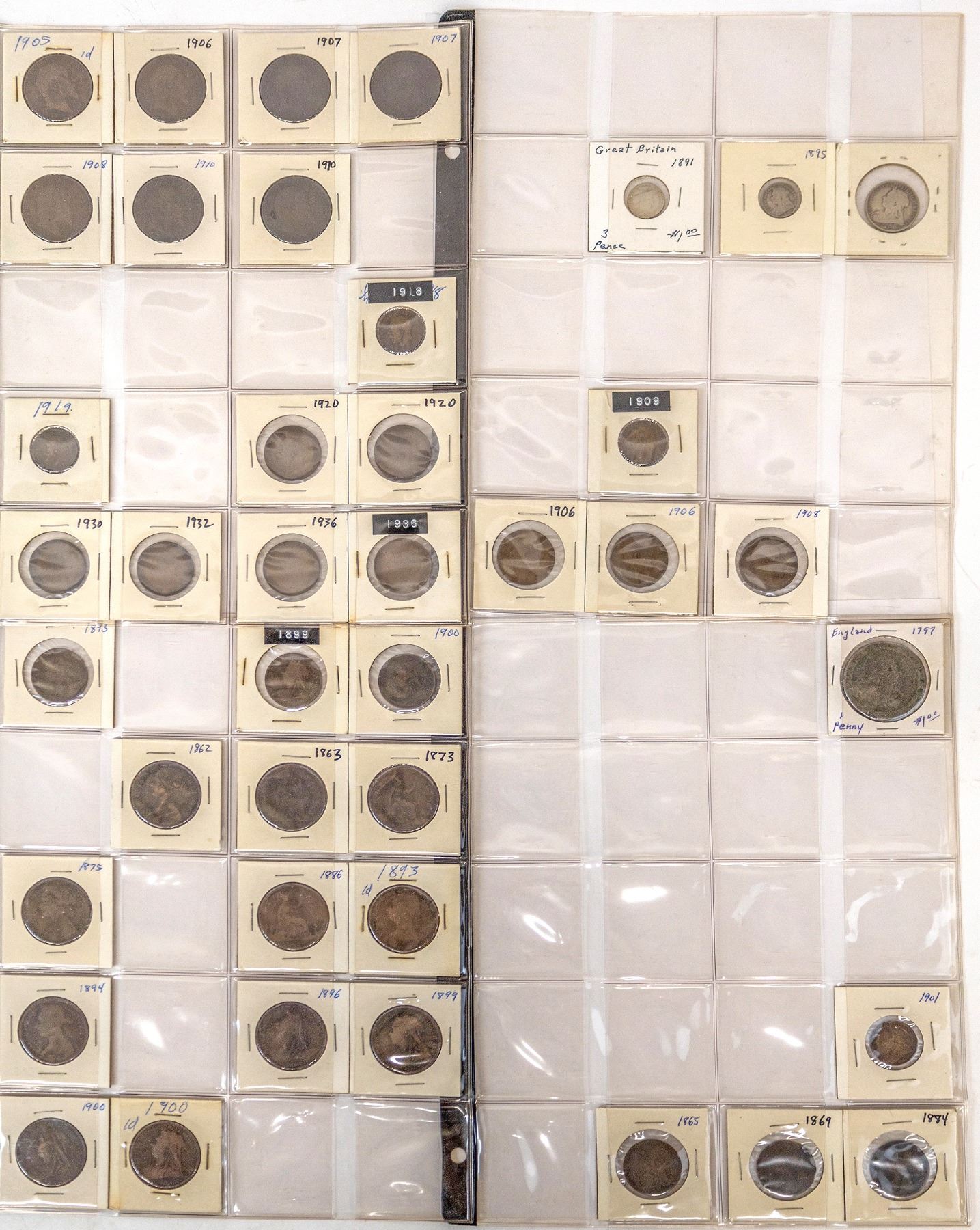 Lot of 38 English pennies, from 1797-1936. Three silver coins: 1891 three pence; 1895 three pence; 1898 one shilling. Pennies dated 1797; 1862; 1863; 1865; 1869; 1873; 1875 and later.