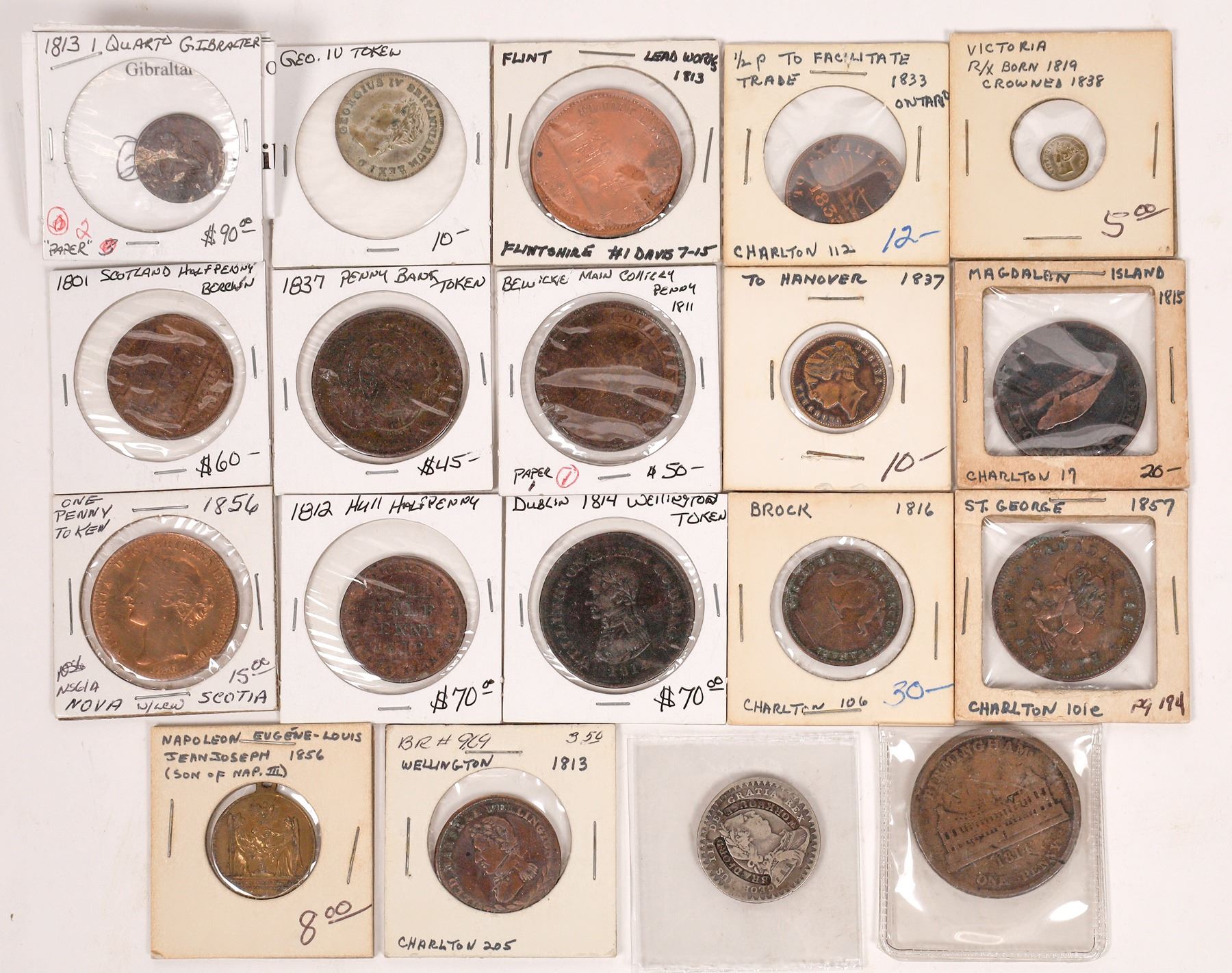 Lot of 20 half penny, tokens and royal medals made in the 1800s. Victoria, George IV. 1814 Wellington token from Dublin; 1801 Scotland; 1813 Flint Lead Works; 1876 Colombo Commercial Company and many more.