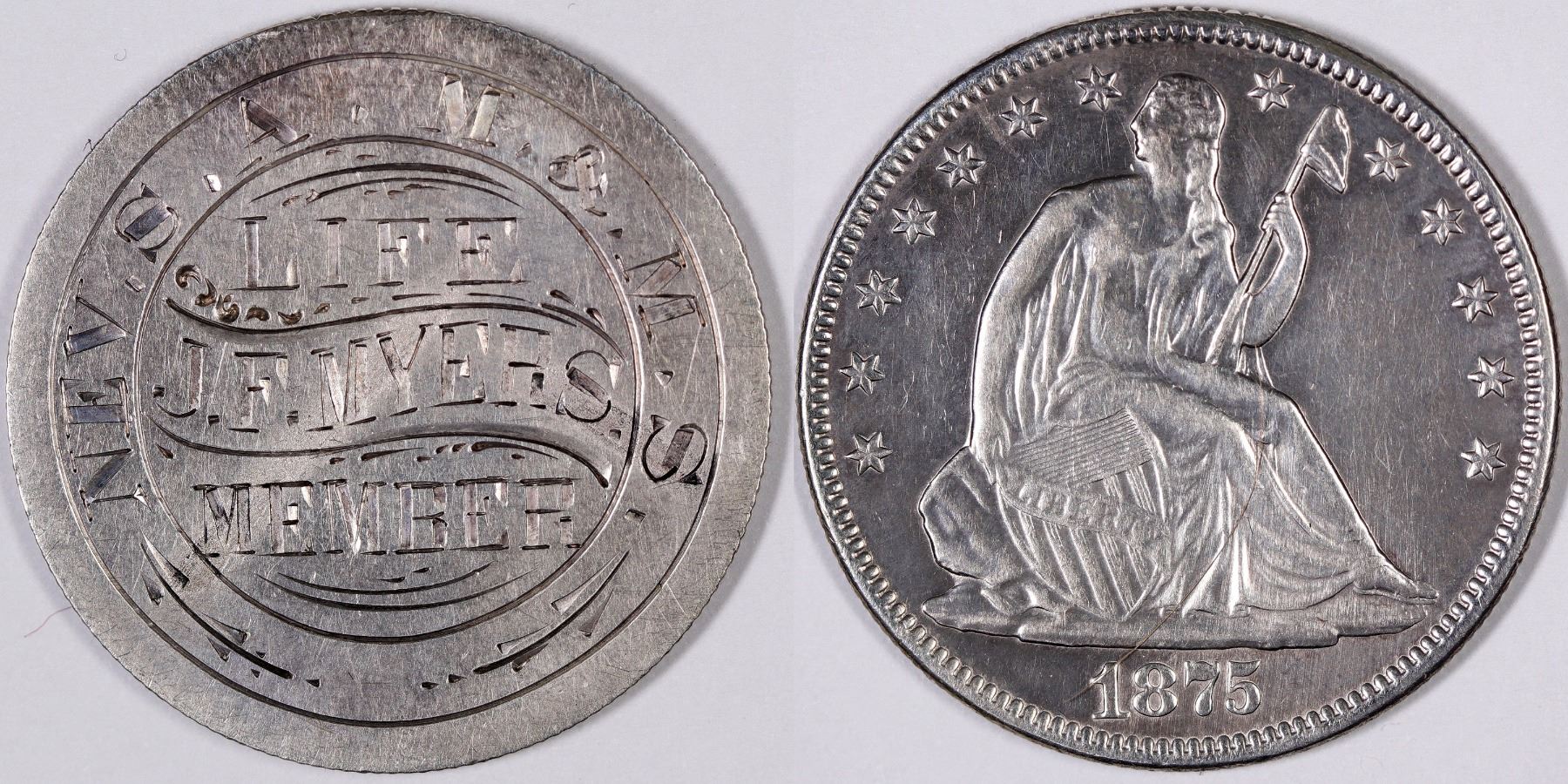 Featured in Holabird's Bottle Book, this piece is an 1875 Liberty Seated obverse, and on the reverse: Nev. S. A. M, & M. S. / Life / J. F. Myers / Member. See Nevada Bottle Book Volume II p221-224 for complete history on this bottle and the Reno drug store merchant John F. Myers who died of a morphine overdose after the sale of his drug store in 1885.