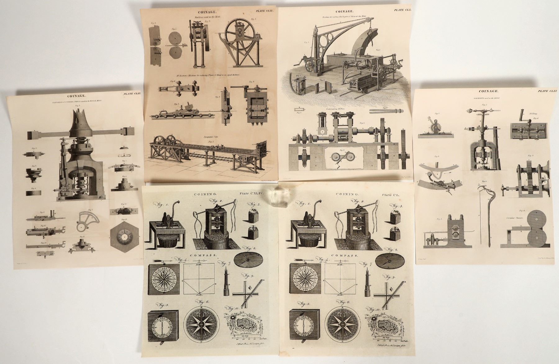 Six pages of engravings of machines used the Royal Mint and The Mint, probably by English engravers, for both Britain and America. Each 8 x 10 inches. Titles include: Elevation of coining press used in the Royal Mint; machines used in the Mint, Machine for casting the Ingots of Silver at the Mint. Unknown book, we believe it circa 1820s.