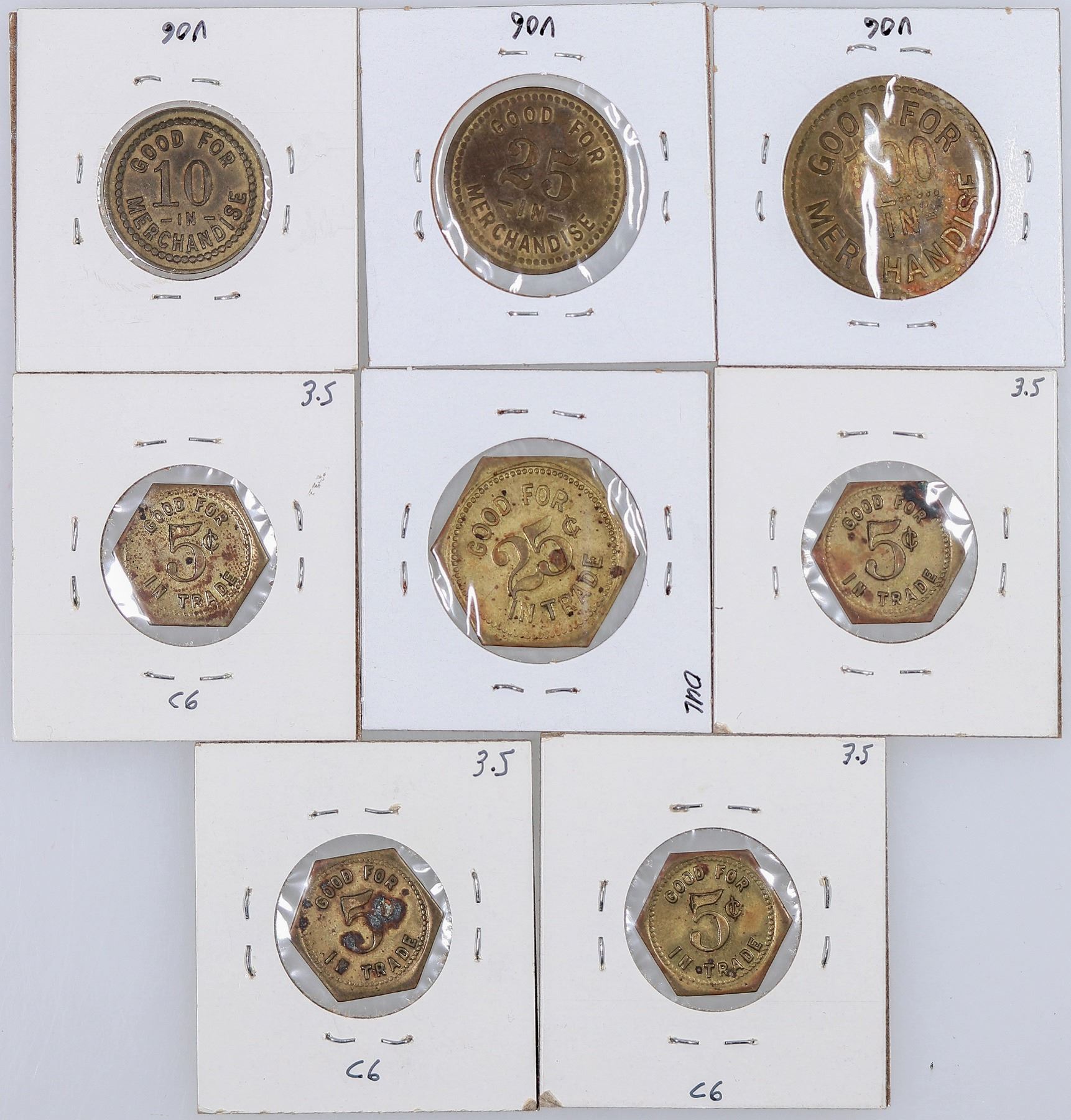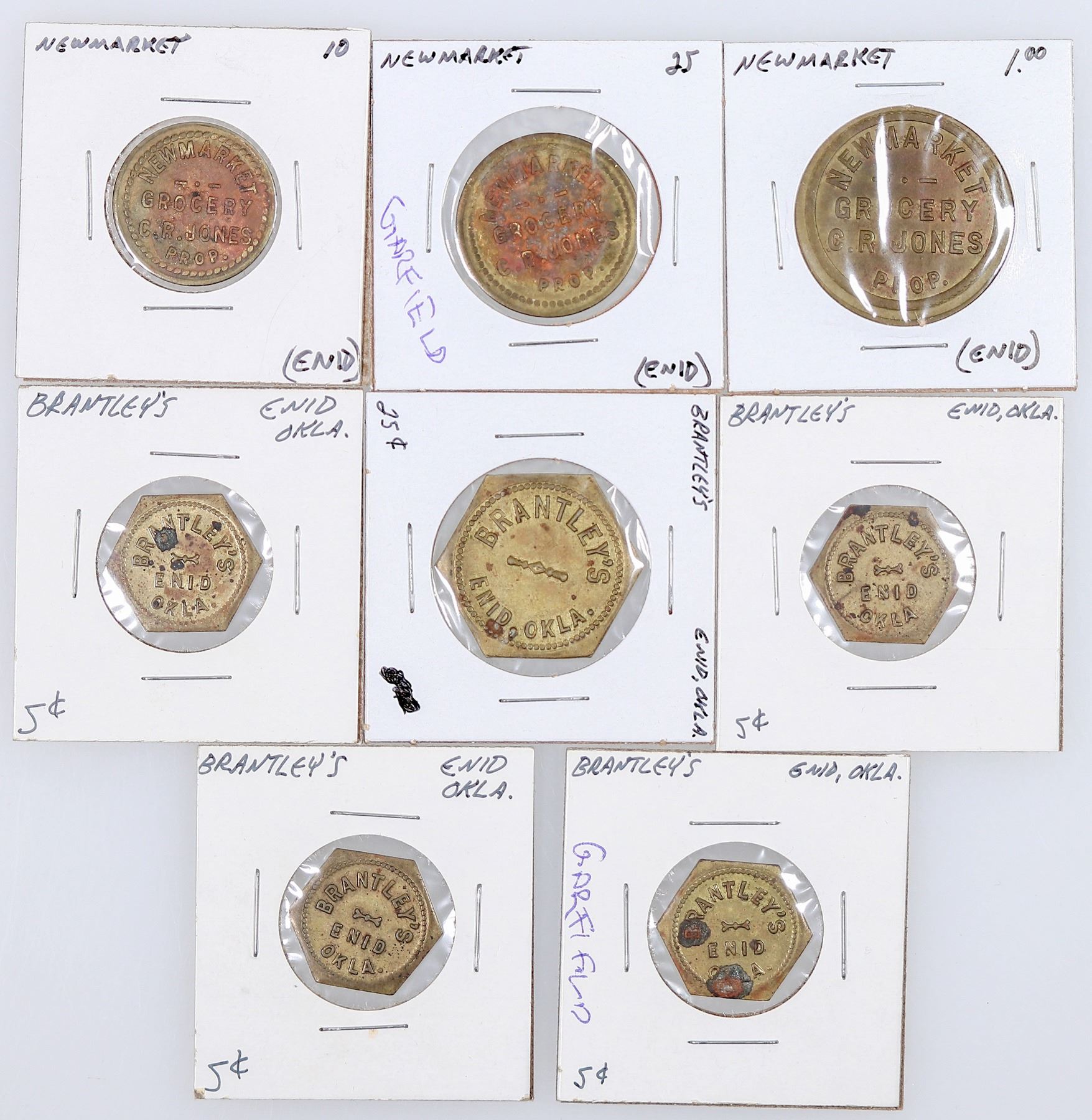 Lot of eight tokens from the Garfield County town of Enid: Newmarket Grocery (3 different denominations); Brantley's (5).