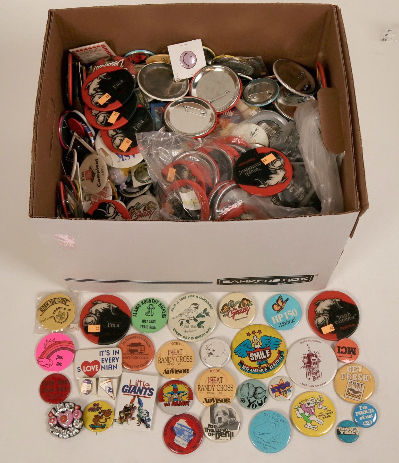 This is an incredible array of pin backs & buttons including political, product endorsements and humor, as well as a few "politically incorrect" sentiments.So many, we could not count. I would say to look at the photos for more detail, but again, too many to zero in on.