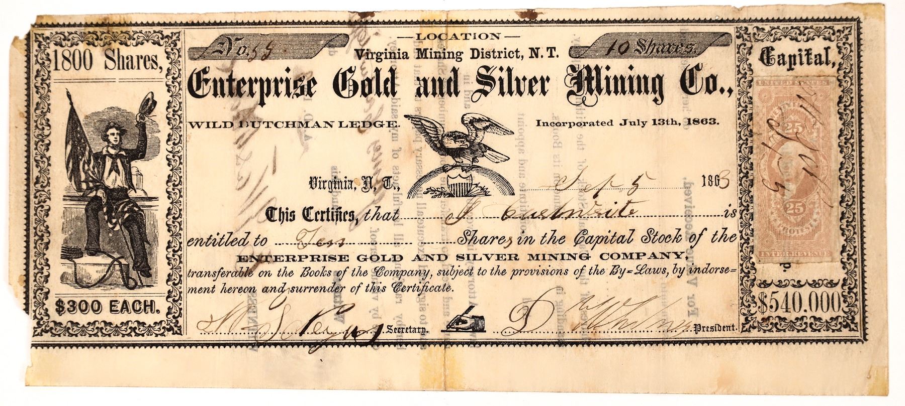 Enterprise Gold & Silver Mining Co. Virginia, Nevada Territory, September 5th, 1863. Rare Comstock Lode stock certificate #59 for 10 shares made out to James Cartwright with patriotic (Civil War period) vignette of a bearded man waving his hat & holding a flag. Black on white printing, with a pink 25-cent protest internal revenue stamp on front. States at top that mines were located at the "Wild Dutchman Ledge" located in the "Virginia City Mining District” incorporated July 13th, 1863. Capitalized at $540,000; issued 1800 shares of stock at $300.00 each. Signed by XXXXX Secretary and XXX Whitney, President. Measures approximately 9" x 4". Condition: Very good-fine, top left corner is nipped with tiny paper loss, also has a smell tear at bottom left corner with paper loss, some discoloration. Virginia City Nevada Franklin Collection