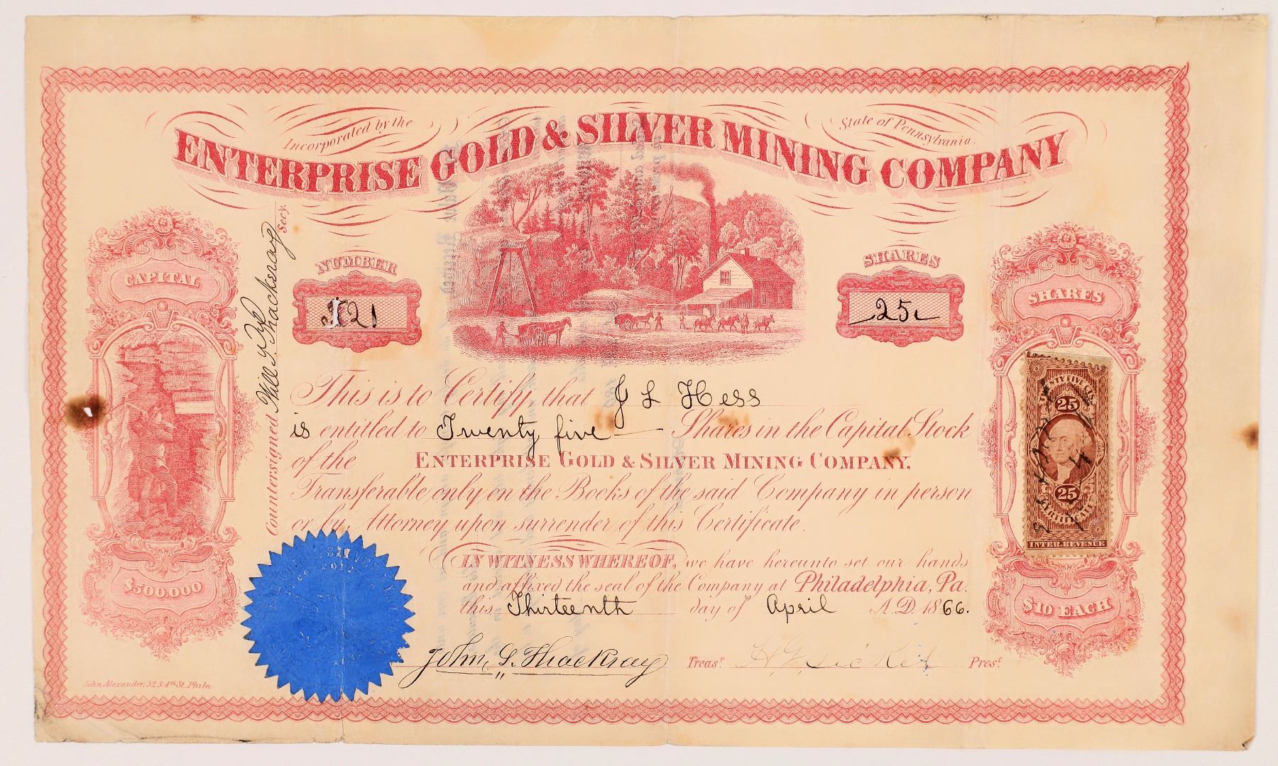 Inc. in Pennsylvania. Issued for 50 shares to JL Hess on April 13th, 1866 in Philadelphia. Signed by president H.G. Sickel and treasurer John Thackeray(?). Not cancelled. Red border and print, blue seal, with two different mining vignettes and a 25 cent US IR adhesive stamp attached on the right. Heavy folds, burn marks, hole. 7.5 x 11" The Enterprise owned a claim of the same name on Last Chance Hill in Aurora, Esmeralda County during 1865-66. Not surprising to see the company incorporated in Pennsylvania, as this was an active period of investment in Nevada mines by Pennsylvanians. [Ref: Stretch, Angel]
