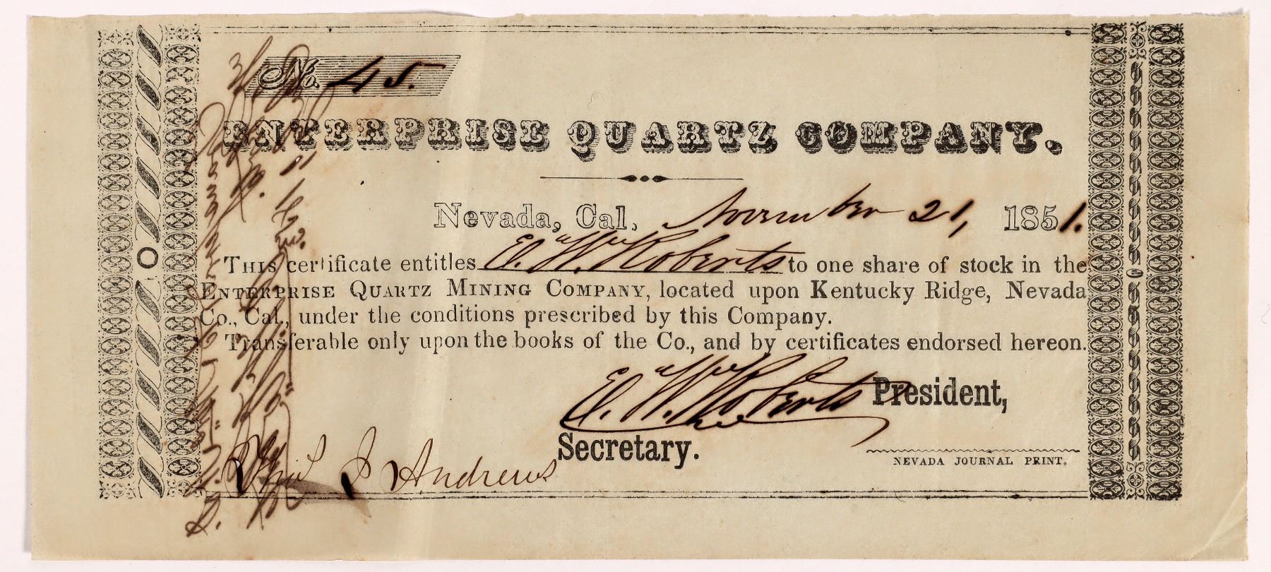 Stock Certificate of the Enterprise Quartz Company, issued in Nevada City, California on November 21, 1851. Printed by the Nevada Journal Print Co. Enterprise Quartz was located in an area known as Kentucky Ridge in Nevada County. Gold-Quartz was discovered in the region in 1850-1851 by an early 49er named George Roberts. E.W. Roberts when the gold tunnel vein was found. However, important production did not commence until the early 1860ís because of difficulties milling the ore. Eventually production in the region would yield between $300,000 and $500,000 per year. Nevada County was the leading gold mining county in the state of California during this time period, making Nevada City one of the most important towns in the state. ìCityî was added to avoid confusion with the State of Nevada in 1864. The stock has two ornate geometric patterns on the left and right margin. It is small, only measuring 3 Oî x 8î. It is signed by President E.W. Roberts and Secretary (Illegible) J. Andrews. A Border and vignettes are absent. The reverse informs of a transfer on July 1, 1853, also signed by E.W. Roberts. Crease on the left, rough top edge. Good Condition. Nevada City California Franklin Collection