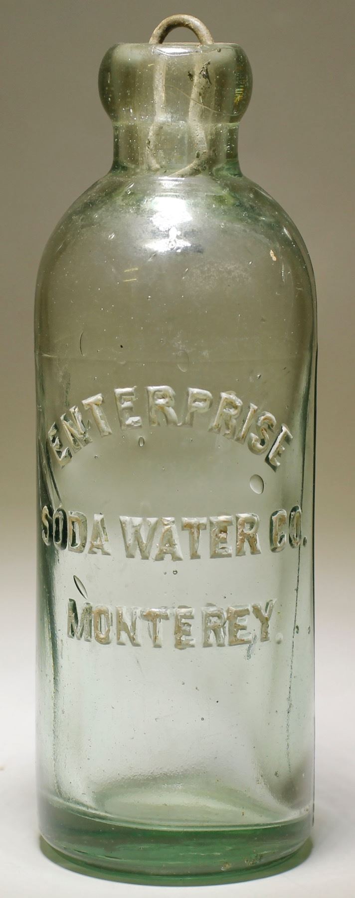 Enterprise ( au ). / Soda Water Co. / Monterey // . Base embossed : # 329 / H ( laying on the rigfht side ! ( The ' H", stands for Holt Glass Works , in West Berkeley, 1893-1906.// Extremely rare, . aqua , hutchinson style soda. 7" tall, and really clean. A tiny amount of base wear, and a few nice bubbles scattered in the left side of the bottle. Nice looking specimen. ( RH ). Date: 1890's 1900. City: Monterey State: California HWAC# 77405
