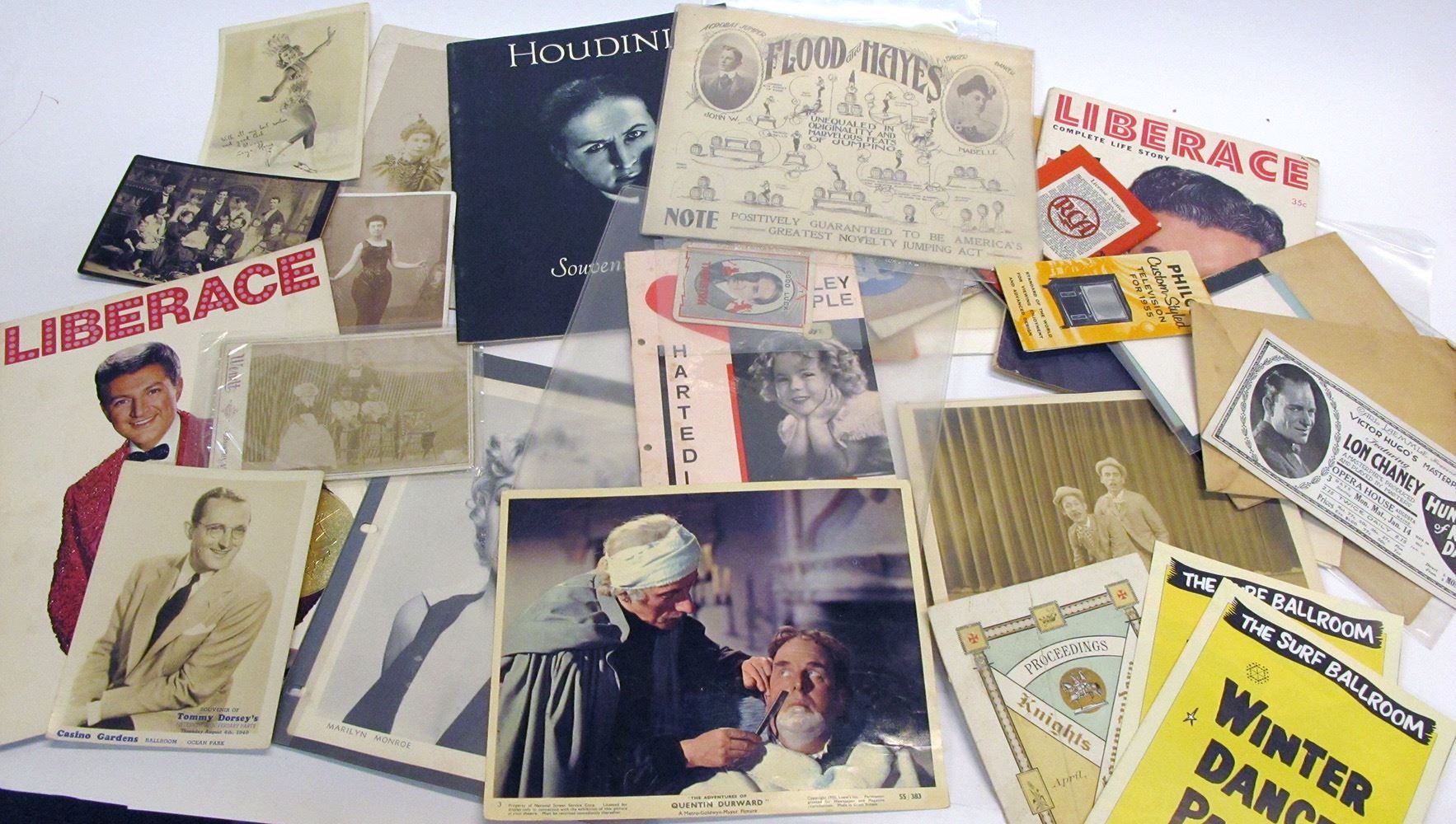 Many black & white photos of "aspiring actors" with their resume's attached, miscellaneous letters dated 1917; photo of Lillian Russell, mugshot of O.J. Simpson; pamphlet of Shirley Temple written in German, 2 Liberace magazines, 1 Houdini Souvenir Program and so much more. Date: Location: HWAC# 55122
