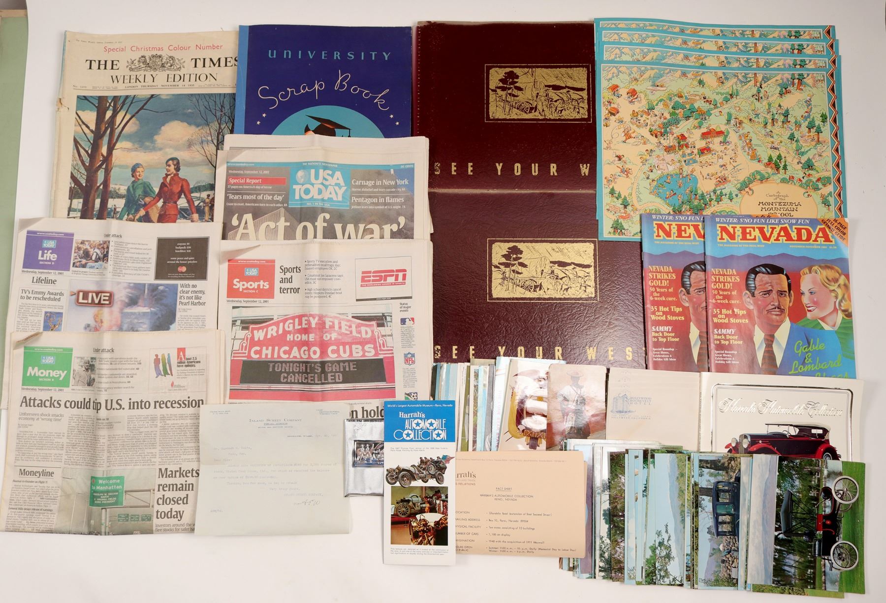 Item #1 o 10 : The Times Weekly Edition, Special Christmas Edition ( 11-4-35), see what it was like then ! 52 pages of great reading and pictures. Item #2 of 10 : 2 giant albums, of " See Your West" with great color prints you can remove! Item # 3 of 10 : The University Scrap Book ( 1934), with pages to be filled with postcards!! Item # 4 of 10 : (4 placemats ), Montezuma Mountain School for Boys ( 1933). Item # 5 of 10 (2 ,1981 magazines)" Nevada, The Magazine Of The Real West" featuring Clark Gable & Carol Lombard &Las Vegas. Item # 6 of 10 : Newspaper, USA/ Today, 9-21-2001, showing the Towers in NewYork, struck by Terrorists. Item # 7 of 10 : 87 Colored Picture postcards from the Harrah's automobile Collection , plus catalog, and visitor information. Item # 8 of 10 : ( 4), Envelopes from the Hollywood Hotel, The Home Of The Stars.Plus, a Mapes Hotel, note pad from 1964, with a fancy silver cover . Item #9 of 10 : Fantastic postcards from all over the world( 38), some picture postcards!! The one from Kenya, the stamps are not cancelled !!. Item # 10 of 10: Letter from the Island Surety Company ( 4-30-07 ) about 3,000 shares of stock in Michael Coal Mines. Tons of good stuff here, and great items. ( RH).
