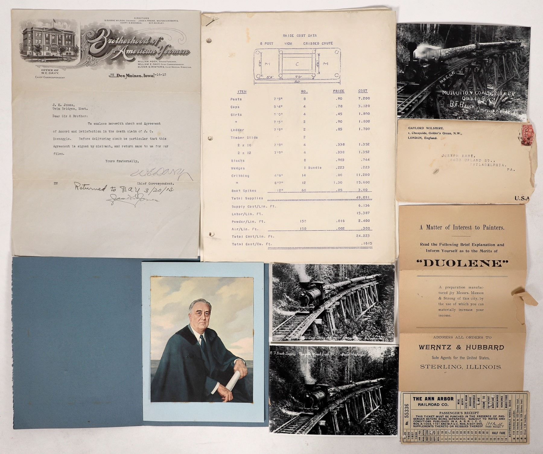 3x Train modern postcards, Ann Arbor RR ticket, 1967 FDR program, parts price list, 1913 Brotherhood of American Yeoman letterhead.