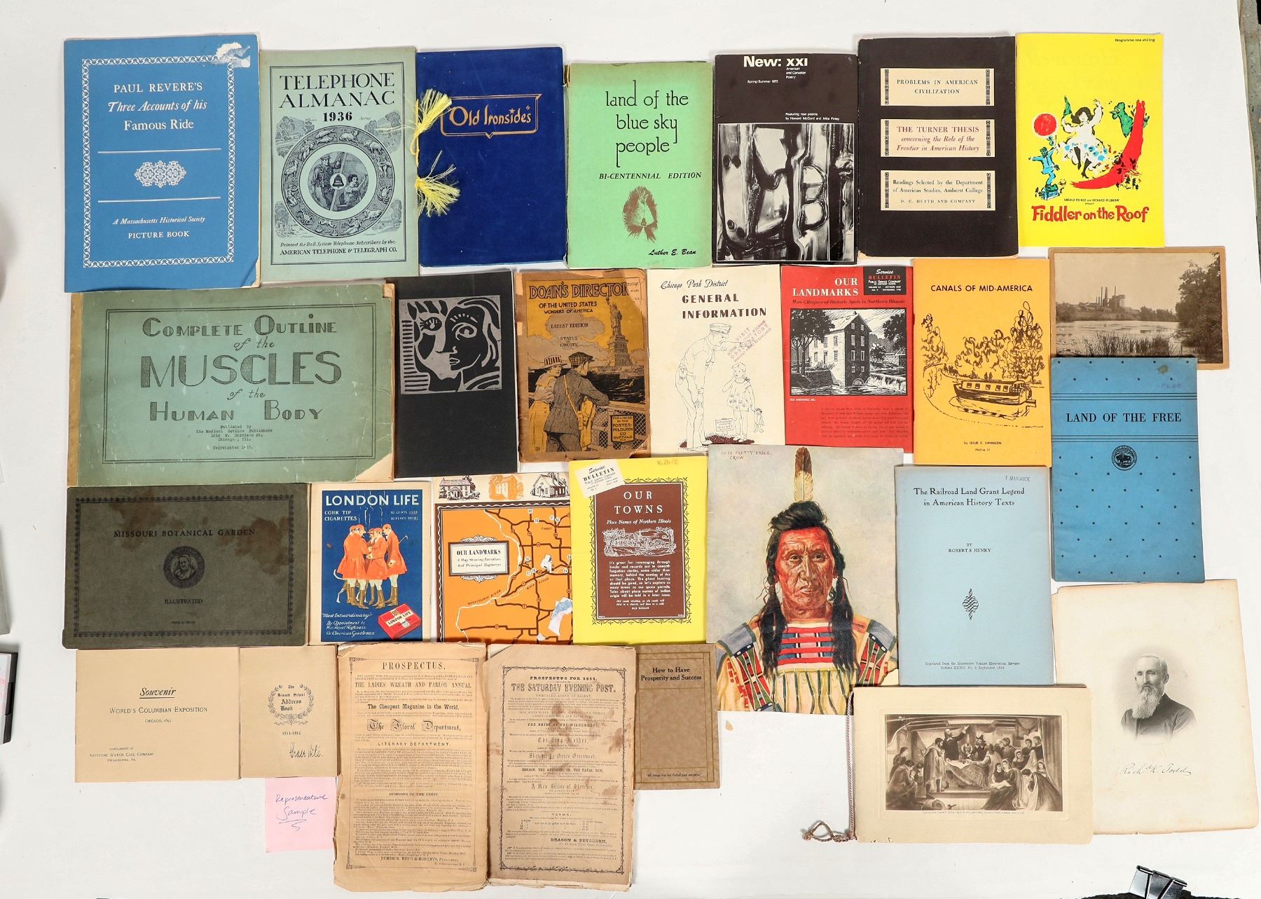 24 books and pamphlets, 7 articles and 8 maps I.E; color rendition of crow Chief Pretty Eagle , railroad grant land legend pamphlet, Canals of Mid-America, nice souvenir handout of the U.S.S. Constitution. partial paper of The Western Rural and American Stockman 1886