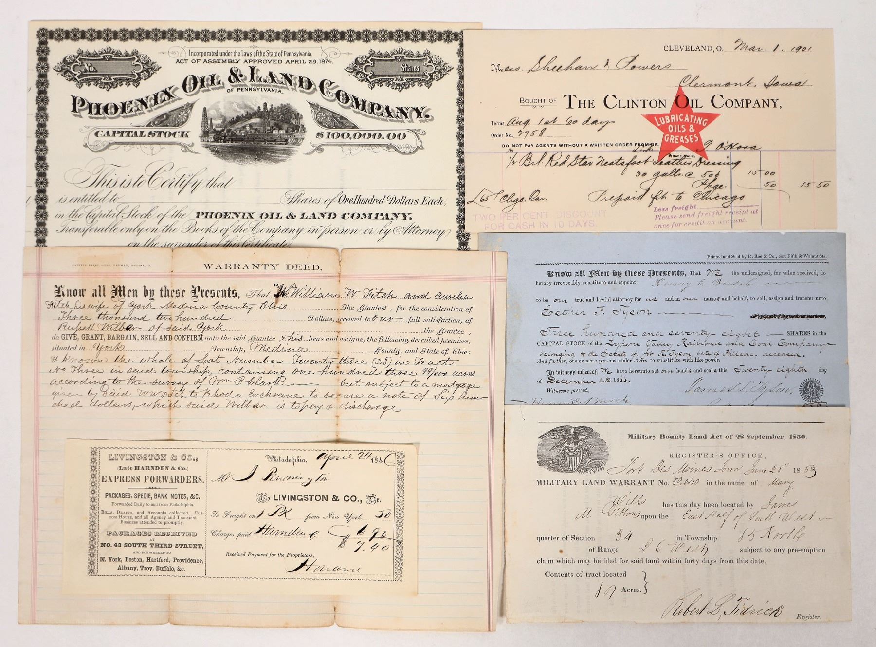 1866 stock POA?, 1846 Philadelphia freight receipt, 1865 York, OH warranty deed with toning etc., 1901 Clinton Oil red star billhead, 1853 Military land warrant Fort Des Moines, IA.