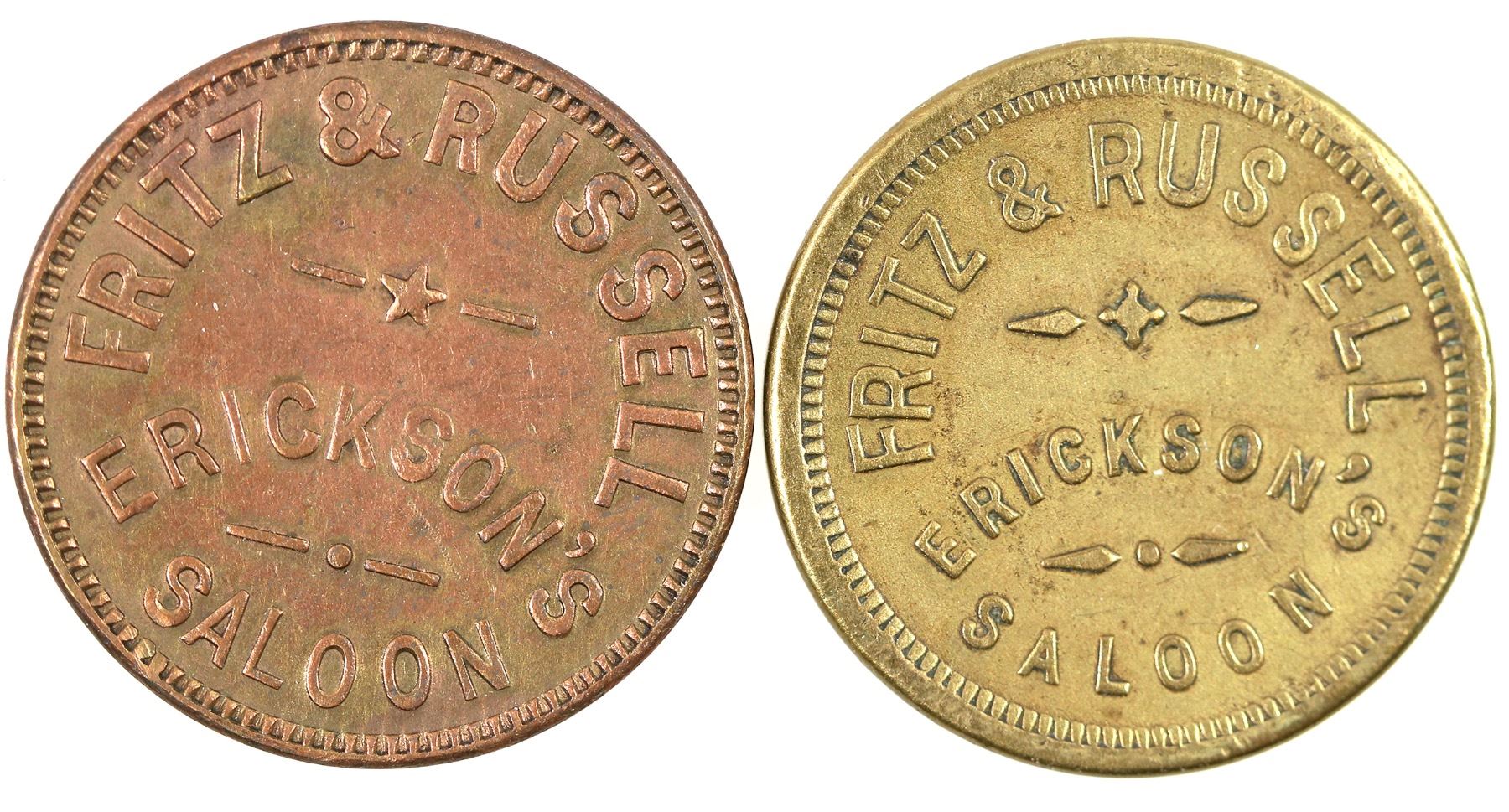 Two tokens from the Portland saloon: FRITZ & RUSSELL / ERICKSON'S / SALOON // GOOD FOR / 2Ω / CENTS / IN TRADE; Br., rd., 24 mm. One has large lettering, one has small lettering. Michael Schepps in his Oregon Historical Society article on Erickson's Saloon noted: ìAt best,î Ericksonís 1925 obituary in the Oregonian noted, ìthe place August Erickson kept was a brothel, and at its worst it was an inspiration to rage and crime.î[ Portland Oregon