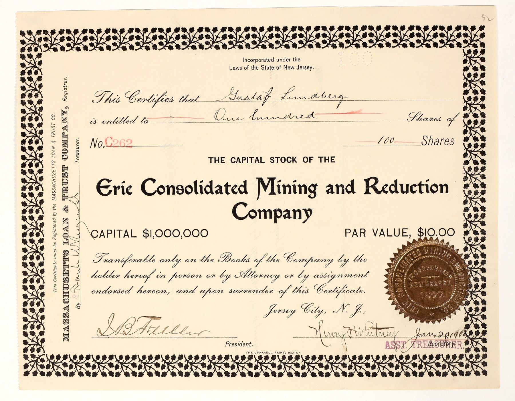 Inc. in New Jersey. No. C262, issued for 100 shares to Gustaf Lundberg in 1903(?). Signed by president Fuller and asst. treasurer Whitney. Not cancelled. Black border and print, gold seal. Folds, toning. 8 x 10.25" They operated the Merriweather and Plutus Mines 12 miles east of Wakefield, Ontonagon County, Michigan. Inc. in 1899, this was the successor to the Wahnita Mining Company. Rare.