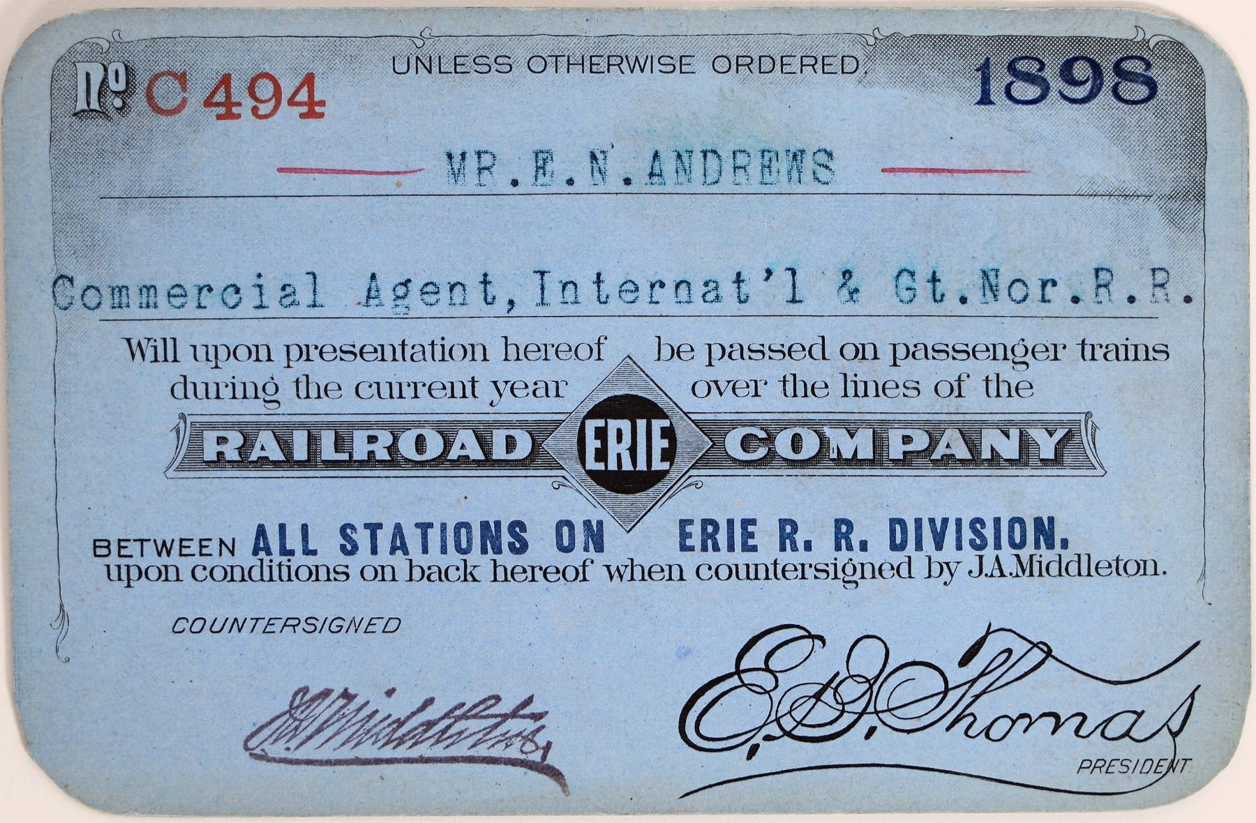 1898 Erie Railroad Company pass, printed signature of E ? Thomas president.