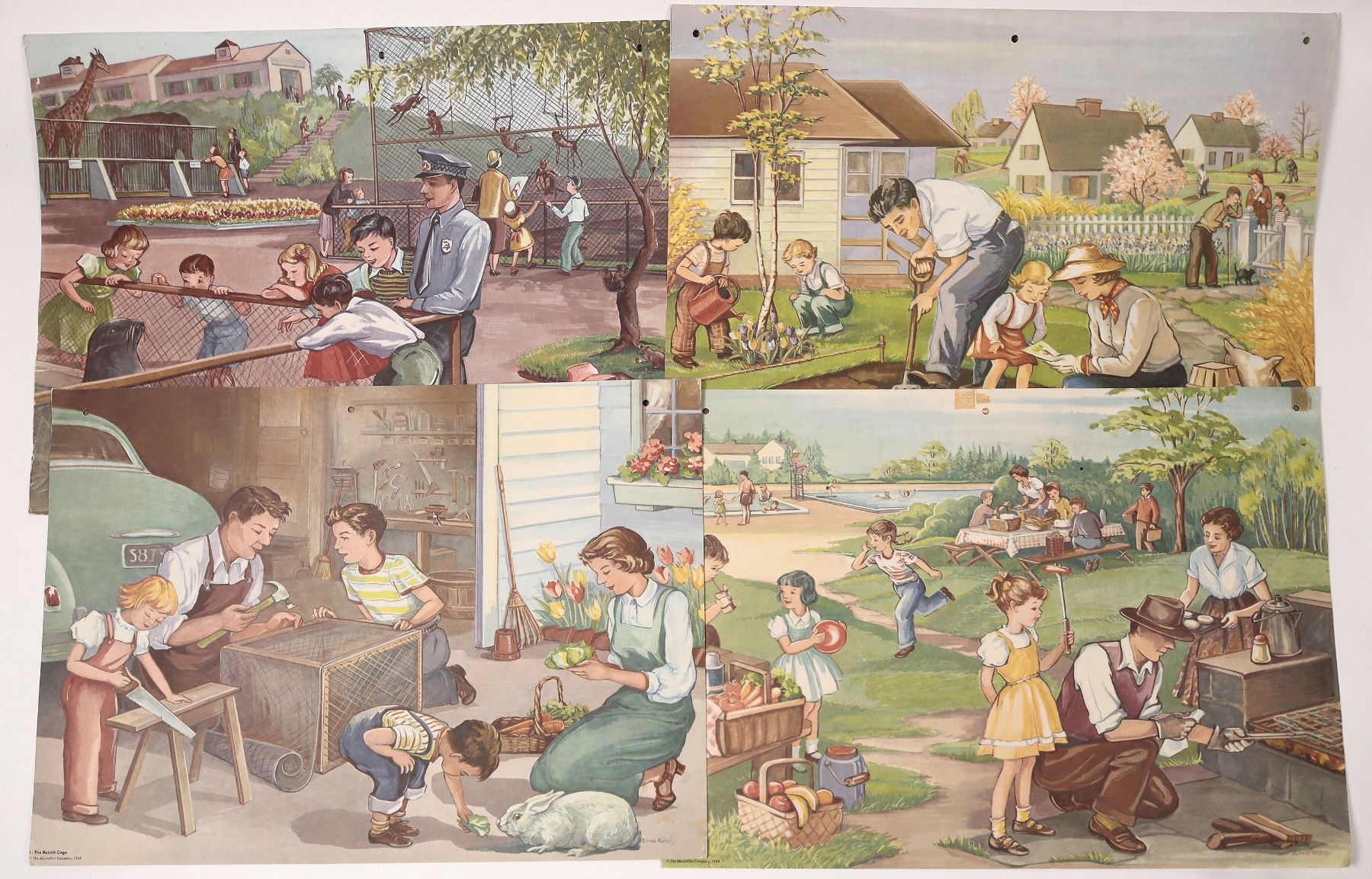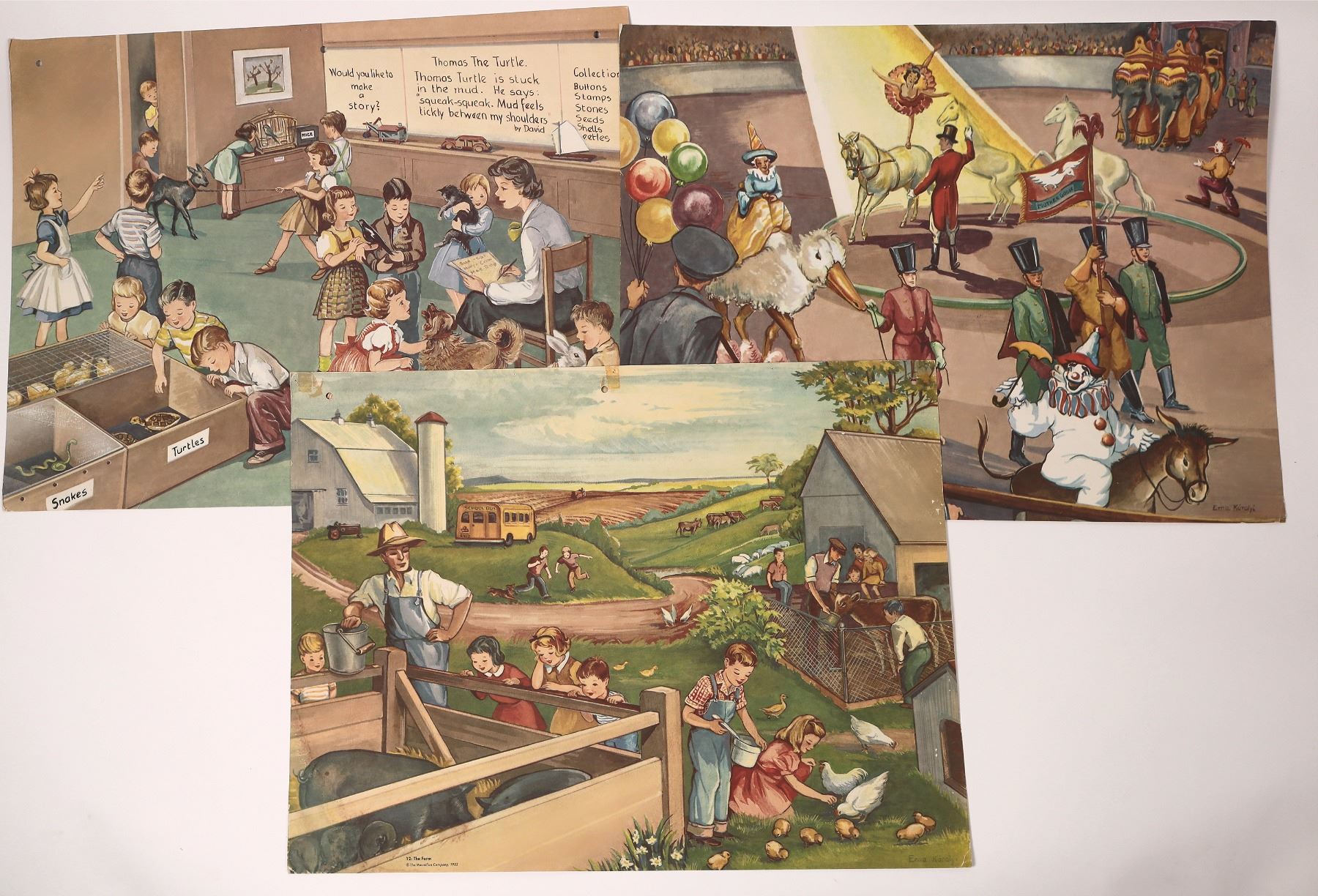 Seven print reproductions by Erno Karolyi on poster board, each measuring 18"x 24"with scenes including 'The Park," "The Zoo," The Garden," The Pet Show, "The Picnic," The Farm" and "The Circus."