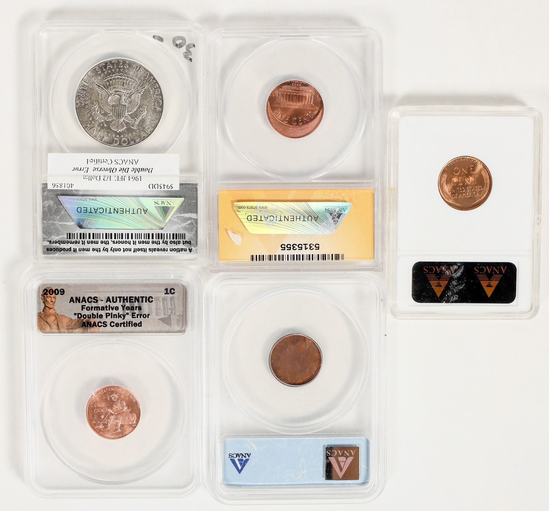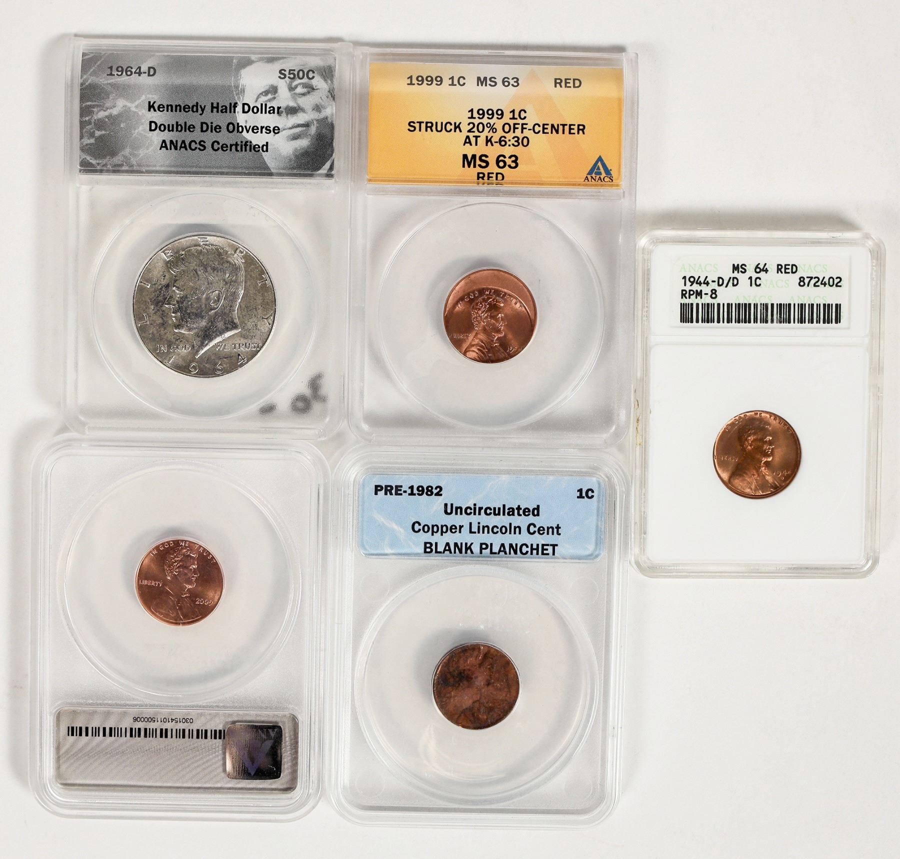 Five certified error coins: 1) 1964-D Kennedy half dollar, double die obverse; 2) ANACS 1999 Lincoln cent struck 20% Off Center; MS 63 red; 3) ANACS pre-1982 uncirculated copper Lincoln cent blank planchet; 4) ANACS 2009 Lincoln Cent Formative Years "Double Pinky" error; 5) ANACS 1944-D/D MS 64 red.