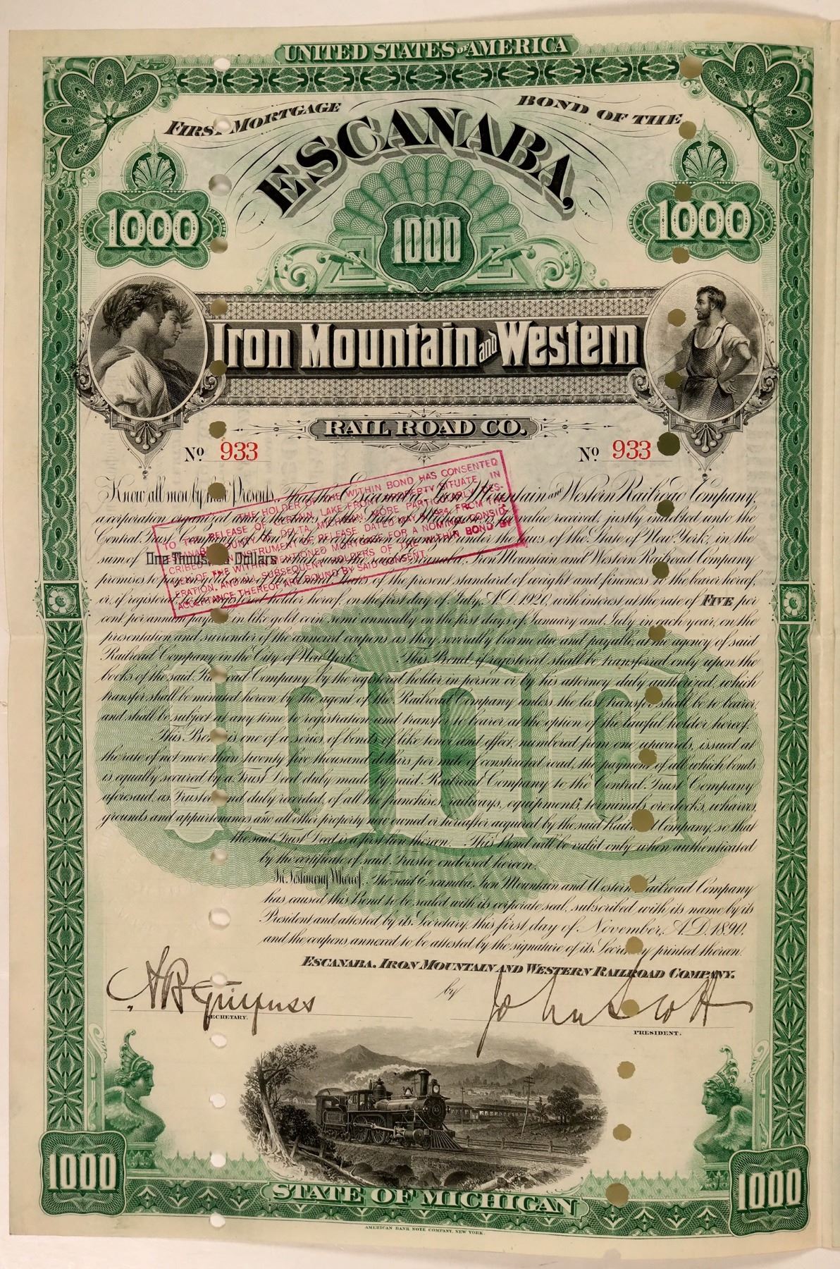 #933, issued in 1890. $1,000, 5% First Mortgage, due 1920. Two females looking right at the left and a man at the right. Nice long train at the bottom. Green. Issued and hole cancels throughout bond and coupons.