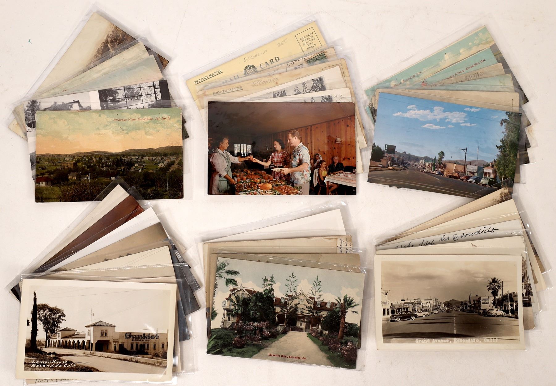Lot of 34. Three mail cards of panorama of Escondido. Few wht. borders. Postmarks: Loa Angeles, Palomar Mountain, Escondido, Moneta , Berkeley, Rinard Ill.. Street level view: City Hall, Hotel Charlotta, Hotel EscondidoSunkist lemon house, library , high school. Street scenes (7) of different era's. Birdseye View" Poway Grade, Escondido Reservoir , ranches, and the town.All in protective sleeves. California Escondido Ken Prag Collection