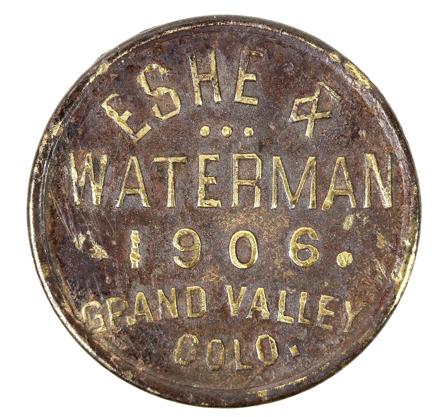 Unlisted denomination! ESHE / & / WATERMAN / 1906. / GRAND VALLEY / Colorado // GOOD FOR / 5¢ / IN TRADE; Br. rd., 21 mm.