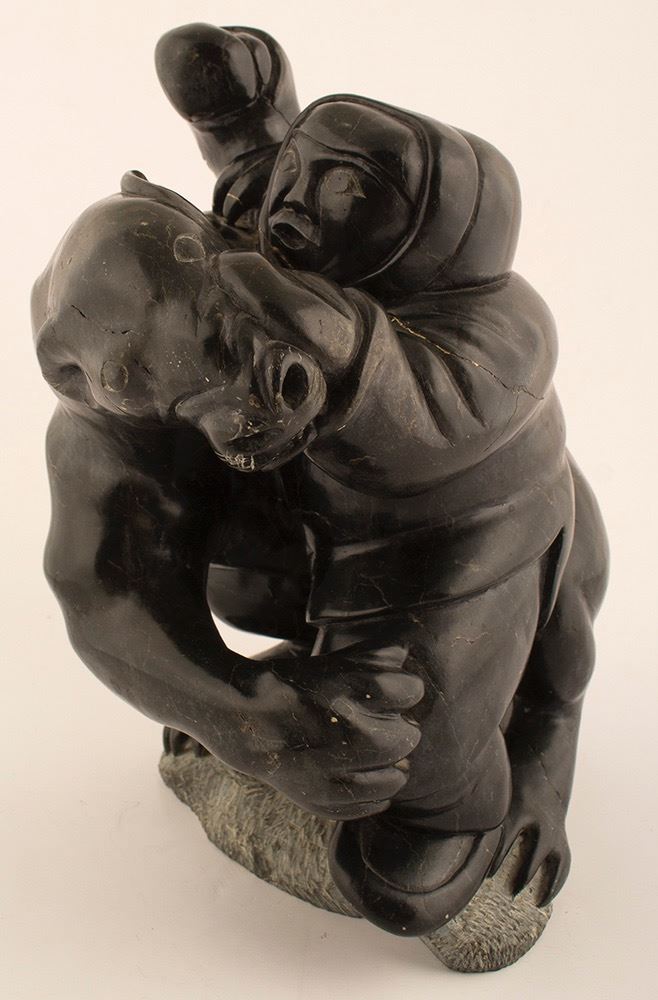 Impressive sculpture of an Eskimo battling a ferocious bear. Sculpture attributed to Inuit artist, Lucassie Echalook who was born in 1942. Missing spear in this mortal battle. Several small bruises in the tail area. 11" x 7" x 9". EchalookÕs sculpture is usually a solid mass with few open spaces; his narrative scenes are compact, as if part of a single form. ÒAn unusual feature of his sculpture is that he often aligns details, such as hands or faces, along the foreground edge, and his figuresÕ anatomical features are distorted into angular planes that converge abruptly, creating an effect that implies movementÓ (Indian and Northern Affairs Canada, 1997). Moreover, EchalookÕs faces can often be distinguished by their Òalmond-shaped eyes, broad noses, and wide mouthsÓ. His sculptures are highly-polished, except for their bases. Date: c.1980 Location: Arctic Regions HWAC# 50571