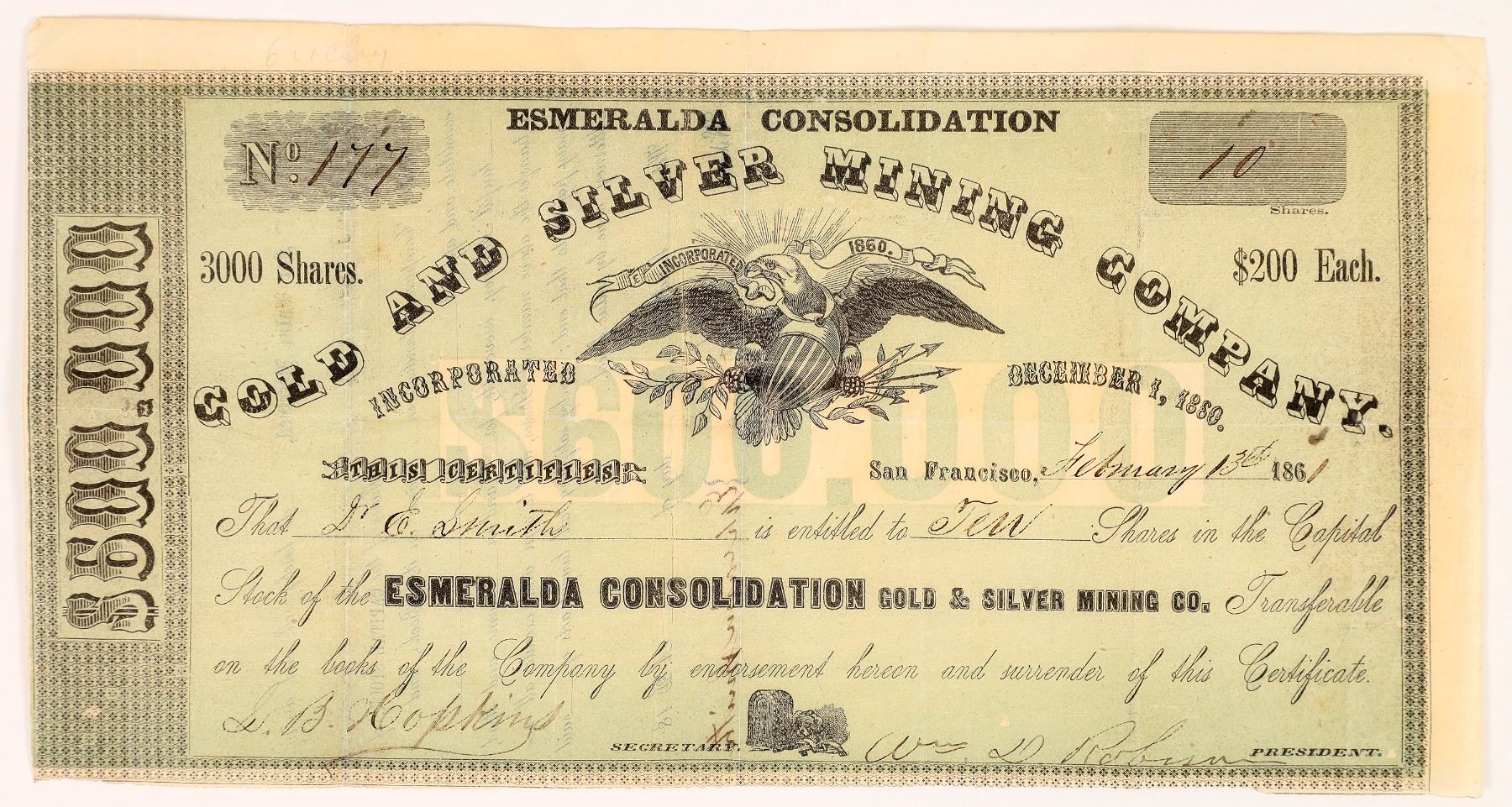 Very early 1861 Aurora stock! Inc. December 1st, 1860. No. 177, issued for 10 shares to Dr. Em Smith on February 13th, 1861 in San Francisco. Signed by president William D. Robinson and secretary Hopkins. Not cancelled. Black print, green underprint and eagle on shield vignette. No printer listed. Folds, creases. 5.25 x 10.25" The Daily Alta California, May 20, 1863 confirms this company was located in the Esmeralda District (Aurora). The notice of incorporation (Daily National Democrat, Volume 5, Number 90, 6 December 1860) lists the location as Aurora, Carson County, Utah--a great example of how Aurora was technically in 3 states (Utah, California, Nevada) before finally being considered part of Nevada. We found no other information on this mine.