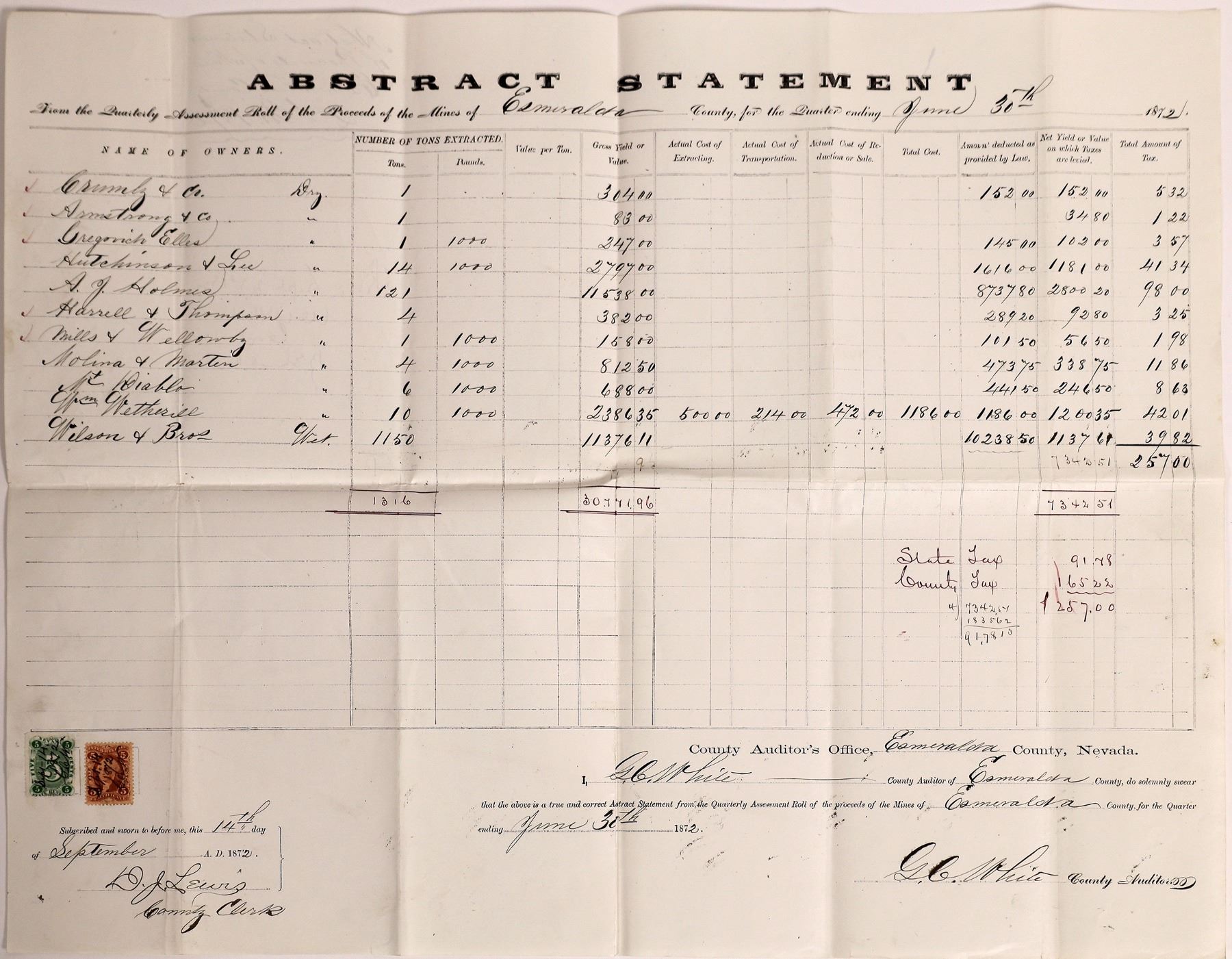 Assessment of 11 mines. Listed by owner. Wilson & Brothers and A. J. Homes owned the mines with the greatest yield; over $11,000. Has a 5c green Nevada revenue stamp and 5c United States stamp. State:Nevada City:Esmeralda County Date:1872 Provenance:
