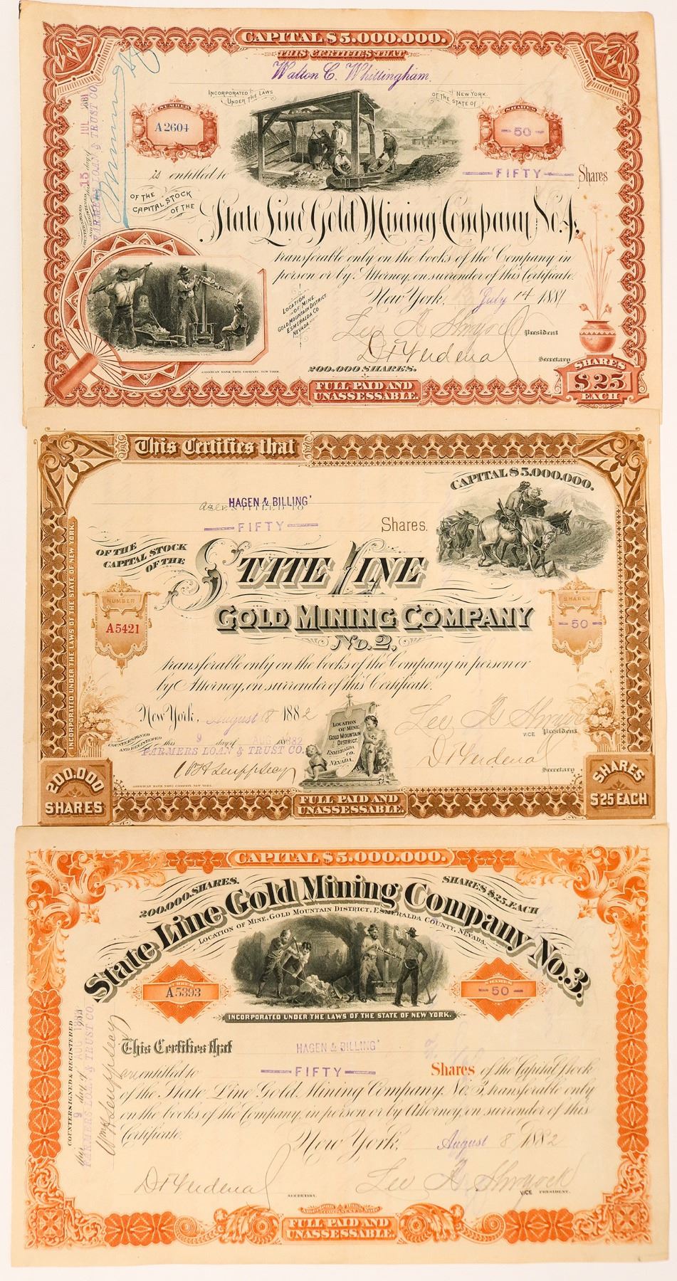 This is a lot of three stock certs issued by State Line Gold Mining Companies 2, 3 and 4. They are all cancelled and in very good condition.See photos for more detail.