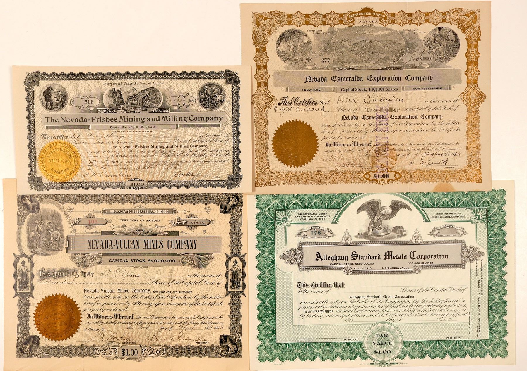 Lot of 4 different. 1) Nevada-Frisbee Mining and Milling Company. Frisbee. Issued in 1910, not cancelled, three mining vignettes. 2) Alleghany Standard Metals Corporation. Klondyke. Unissued. c.1930s. 3) Nevada Esmeralda Exploration Company. Issued in 1910, not cancelled. Three mining vignettes. 4) Nevada-Vulcan Mines Company. Sodaville. Issued in 1903, not cancelled. Multiple mining vignettes. Good to very good condition. Please inspect. Ken Prag Collection
