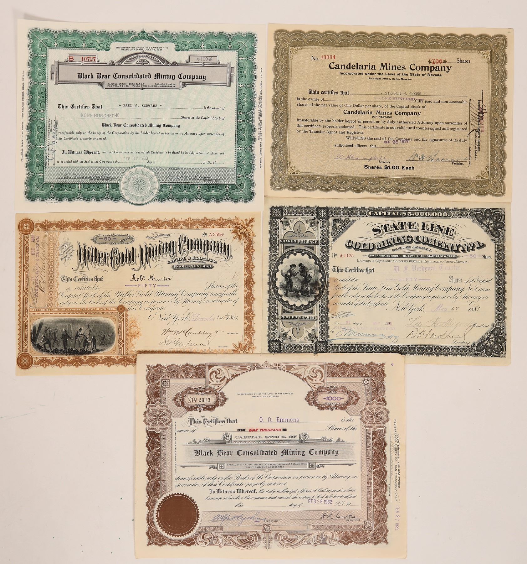 5 issued c. 1881-1960. State Line, Silver Peak, Candelaria. Miller Gold, State Line Gold-stained, Candelaria Mines, Black Bear Cons brown and green.