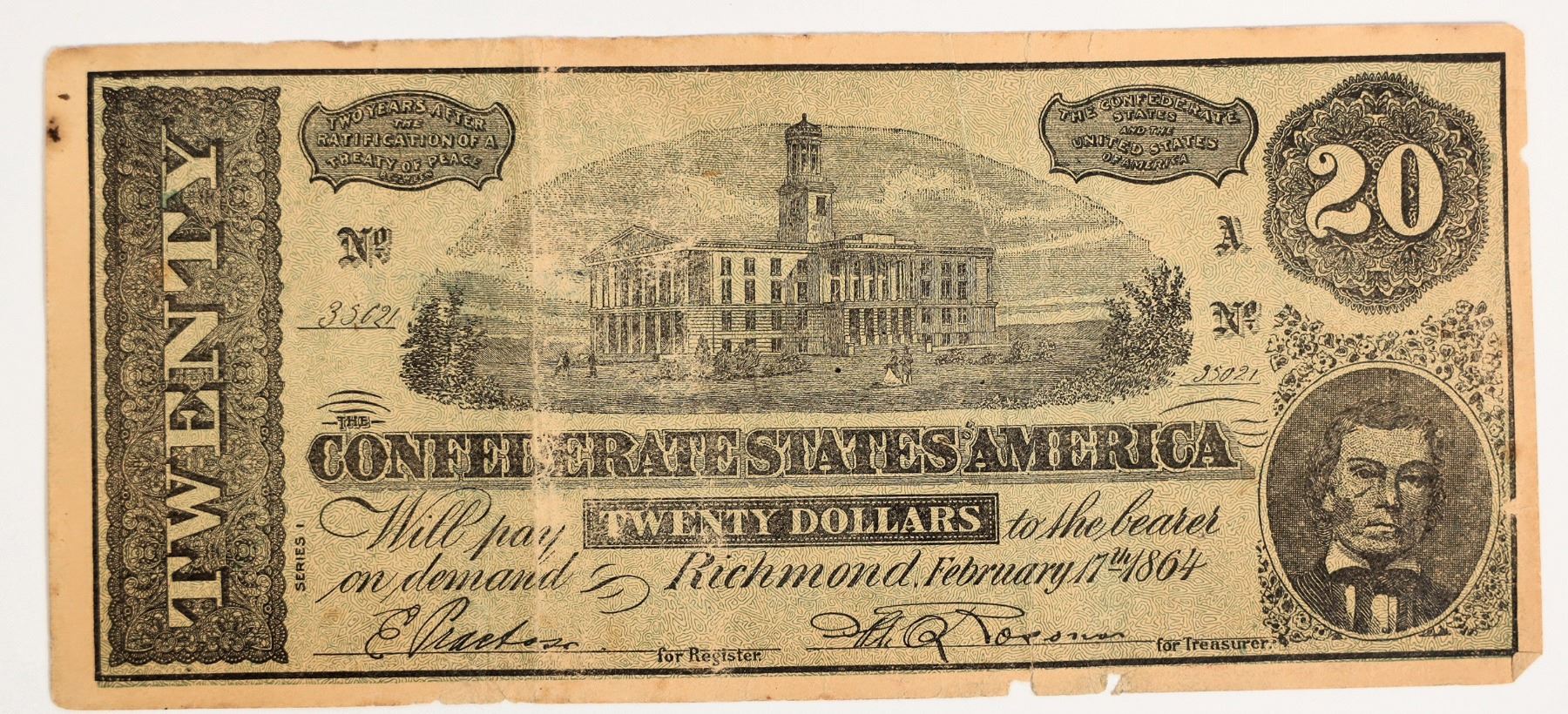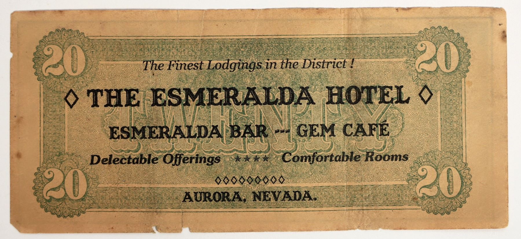 Extremely rare; possibly unique. The Finest Lodgings in the District! / The Esmeralda Hotel / Esmeralda Bar --- Gem Cafe / Delectable Offerings ---- Comfortable Rooms / Aurora, Nevada // (Facsimile $20 Confederate note). Folds, heavy toning, some chips along the edges. 7.25 x 3.25" The Esmeralda Hotel was originally built in the 1860s to serve as the Mono County Seat when people still thought that Aurora was in California. When new surveys proved that Aurora was in Nevada, the Esmeralda returned to its function as a hotel. Comes with photocopied image of the hotel.
