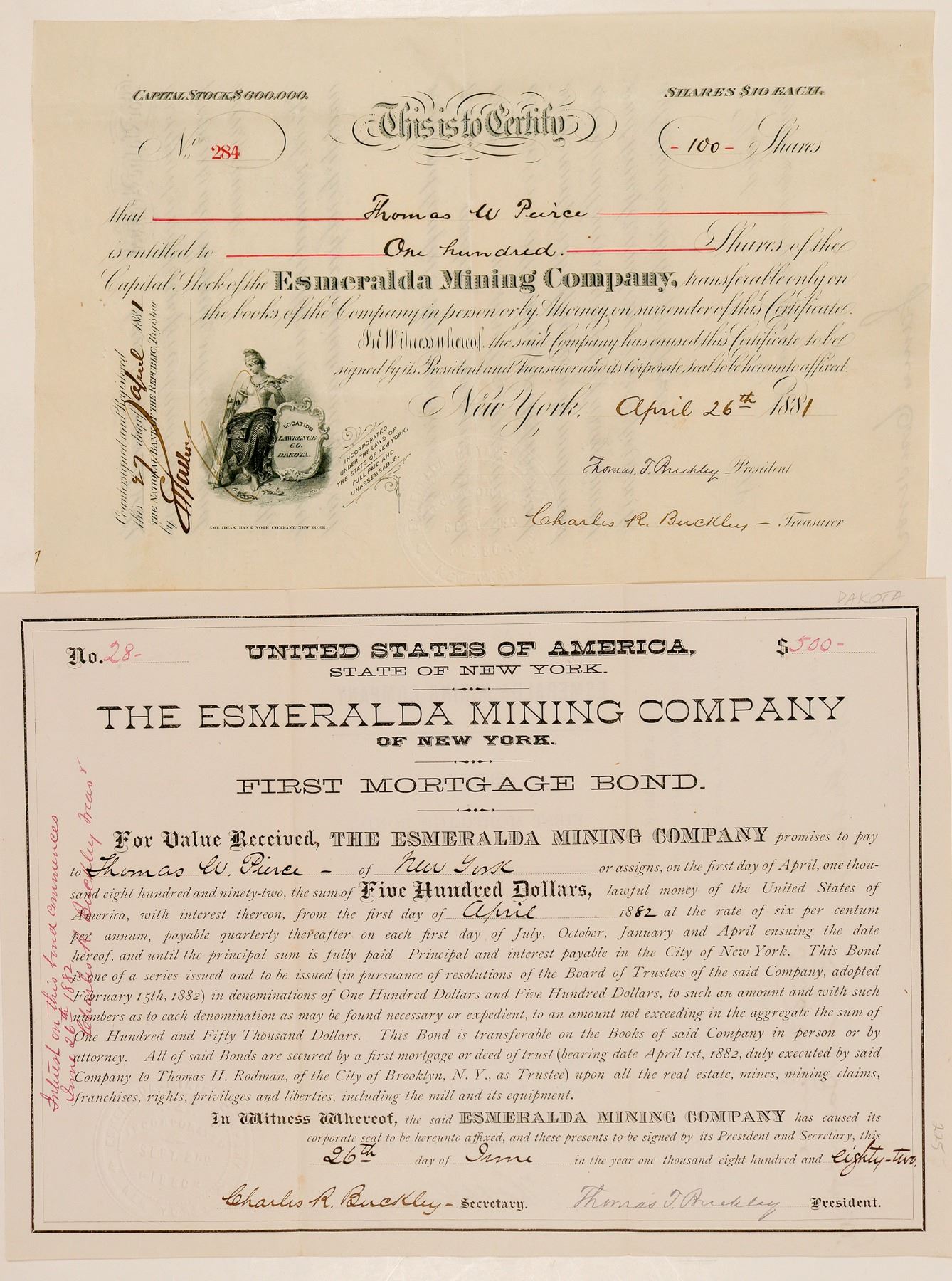 Lot of 2 different for the same mining company based in Lawrence County Dakota. 1) Stock No. 284, issued in 1881 to Thomas W. Pierce. Not cancelled. Small allegorical vignette with mine location.Pinholes, deep folds. 2) Bond No. 28, issued for $500 in 1882 also to Thomas Pierce. Not cancelled. Folds. Same corp. signatures. William C. Fowler is superintendent of the mines and mills beginning in Oct. 1881. Mills were erected in June, 1881. "They have sixty stamps and a capacity for crushing forty tons of gold quartz per day. They employ eighty men with average wages per day of $3 to $3.50. They use about eight cords of wood per day. These mills are located in Black tail Gulch, near Central City." [Ref: "Historical Atlas of Dakota", 1884] () Ken Prag Collection