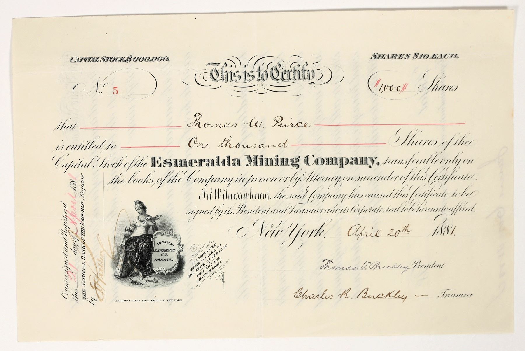 Rare. "Location Lawrence Co. Dakota" printed at bottom left. Inc. in New York. Low number 5, issued for 1,000 shares to Thomas W. Pierce in 1881. Signed by president Thomas T. Buckley and treasurer Charles Buckley. Folds. 6.25 x 9.75" Operated two miles north of Lead.