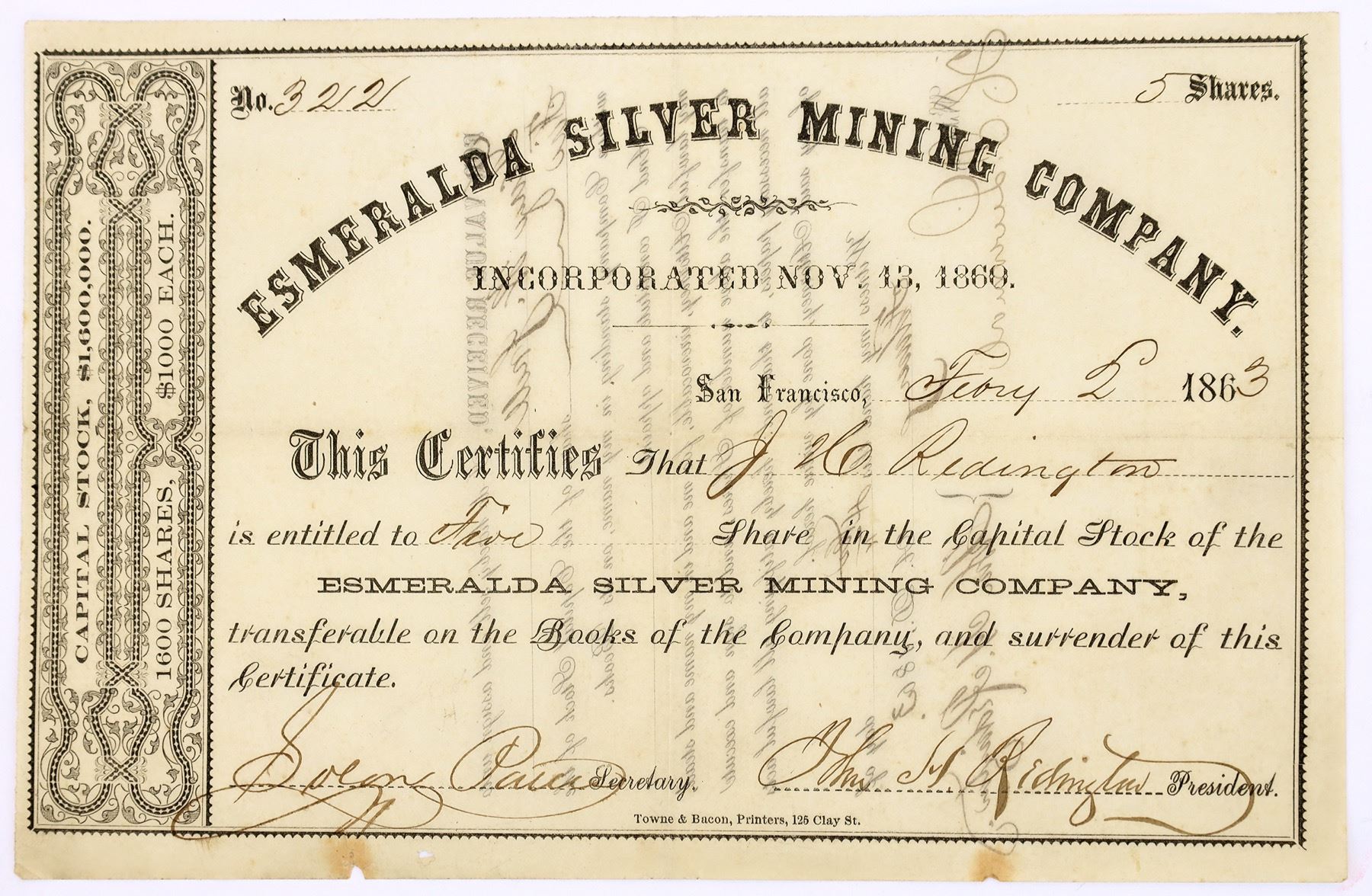 # 322 for 5 shares to John H Reggington. Signed by president Reddington (owner of 1st drug store in San Francisco) and Solon Patrick. Dateline San Francisco 1863. Incorporated November 13, 1860. Self identified. Towne & Bacon printers. Light staining and two small holes bottom border. Although there is no definite evidence this is an Aurora mine, it was confirmed in a November 16, 1860 notice in the Sacramento Daily Union. Notes on Reddington and Pattee.