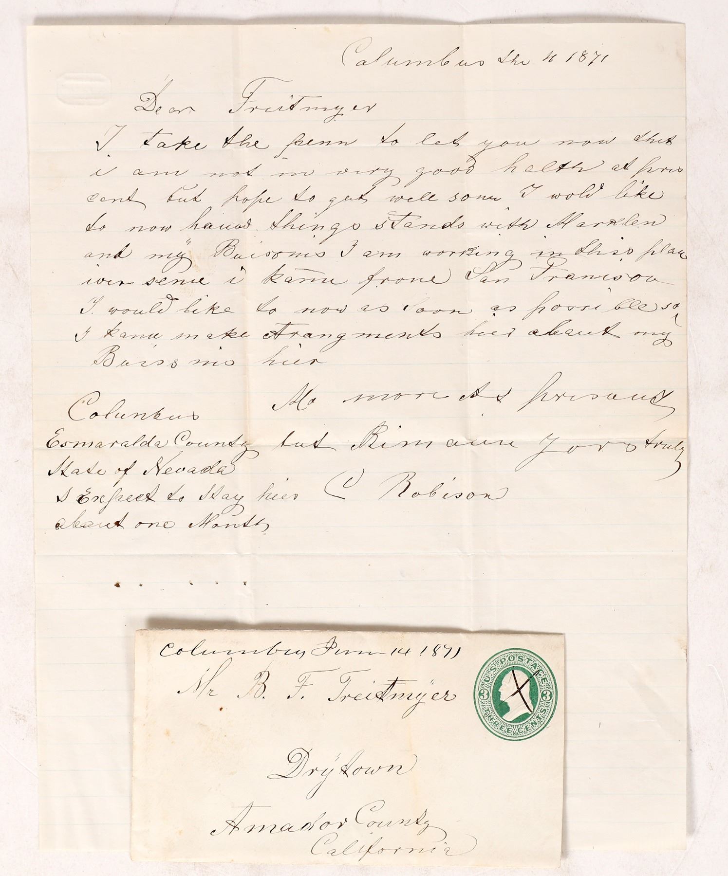 Handwritten letter and cover. Letter originates from Columbia Esmeralda County Nevada and is addressed to one Mr. F.T. Treitmyer of Drytown, Amador County, California. The cover has a green three cent Washington stamp that is hand cancelled. Please see photos for more details. Drytown California
