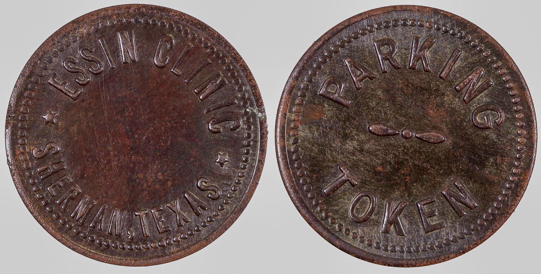 ESSIN CLINIC / SHERMAN TEXAS // PARKING / TOKEN (no comma obverse, pointed ends on propeller reverse); Br., rd., 22 mm.