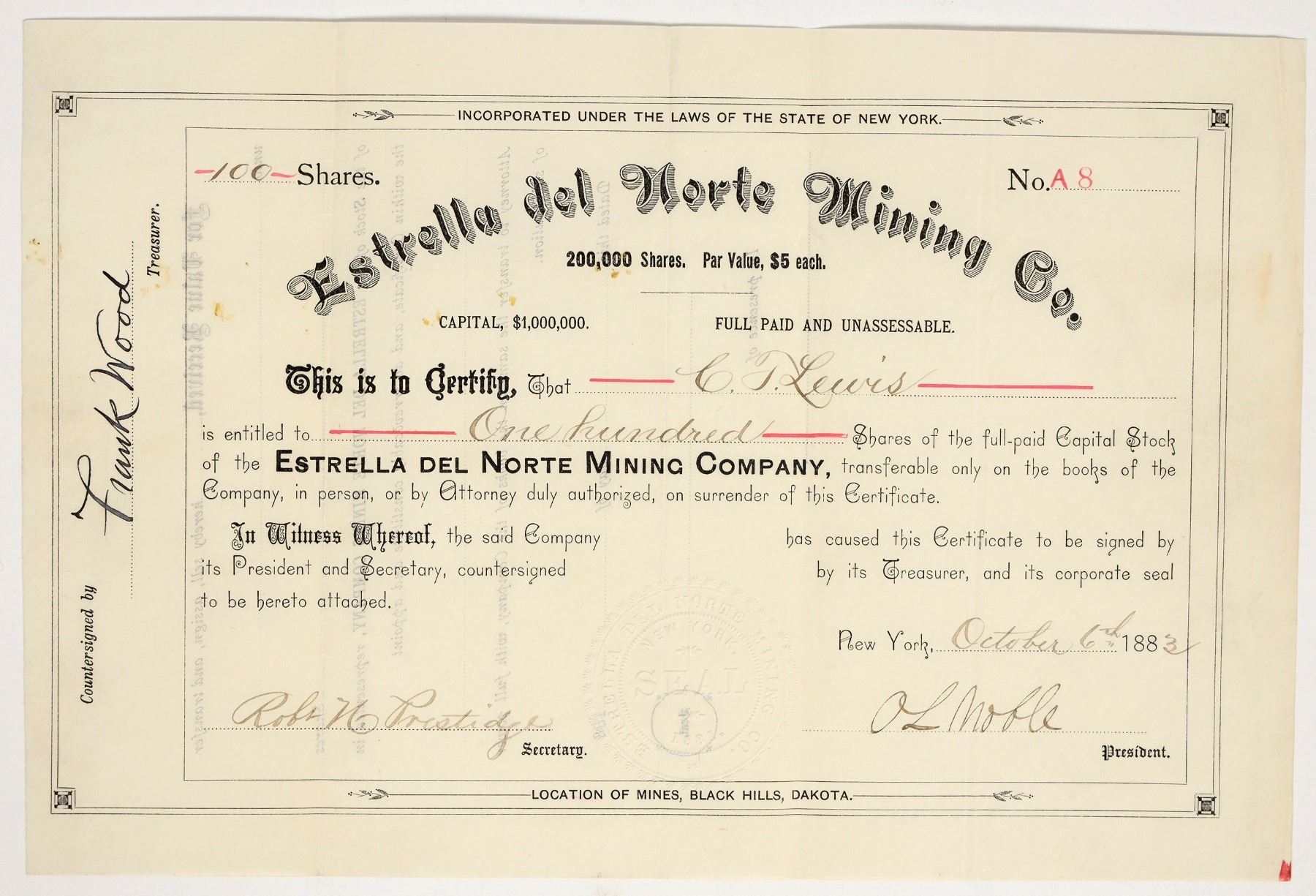Very rare. "Location of Mines, Black Hills, Dakota" printed at bottom center. Inc. in New York. No. A8, issued for 100 shares to CT Lewis in 1883 in NY. Signed by president OL Noble and secretary Robt. Prestidge. 6.75 x 10" Folds, a few small stains. Operated on Rapid Creek, Pennington County in the Confederate Mining District near Deadwood.