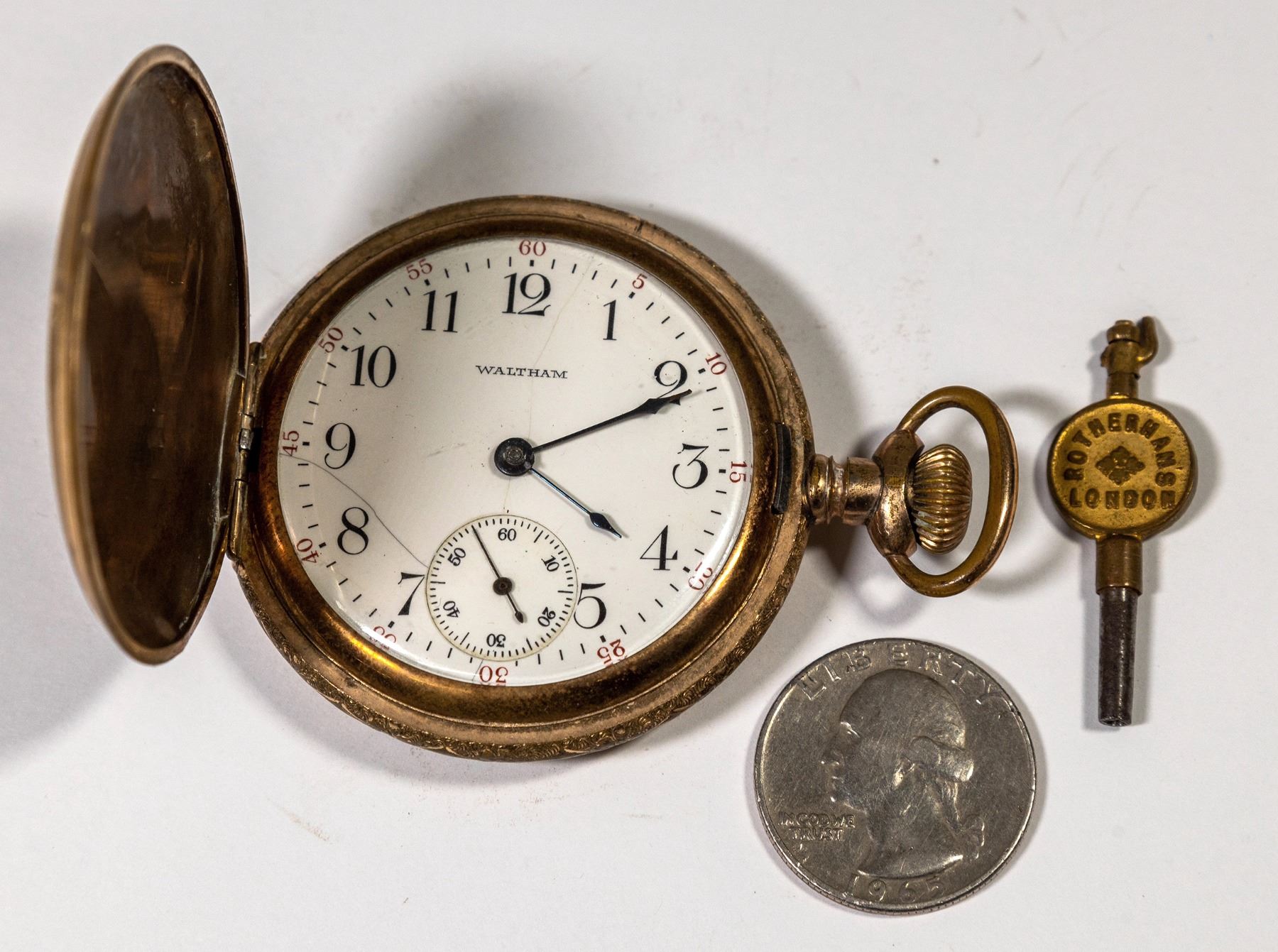Waltham American Watch Co. 14K gold (Etched and engraved) case. Hunter Case Pocket Watch measures 47mm O.D. (1.75"). White with Arabic numeration. Not running, some case wear. Key included in lot, but watch is not key wound. State:Massachusetts City:Waltham Date:cearly 1900's Provenance: