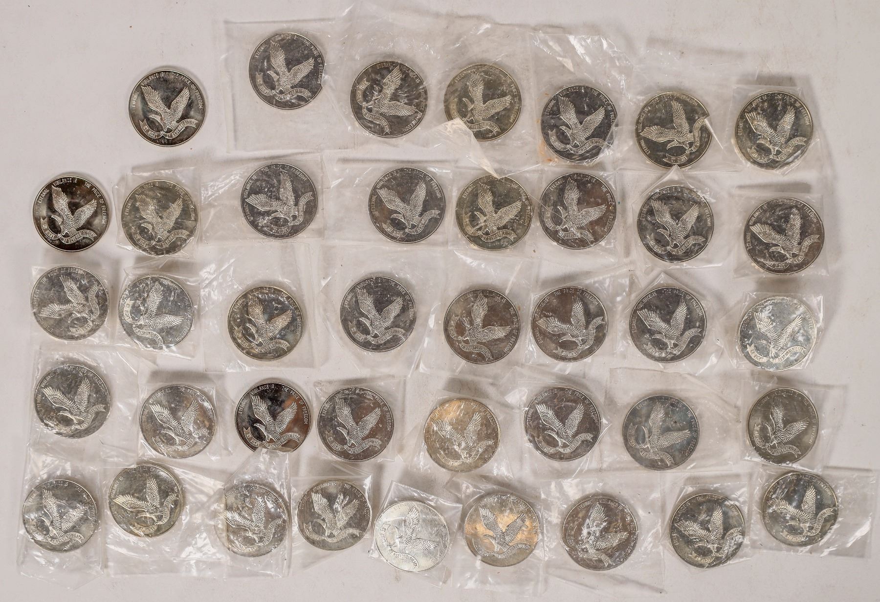 Forty white metal tokens: round, 34 mm. Obverse: Eternal Vigilance Is The Price of Freedom (pictorial eagle holding a banner) My Right / My Responsibility; reverse: To / Enslave A / Nation - First / Locate The Guns / Then Disarm It / 1968. All but three are in plastic, uncirculated.