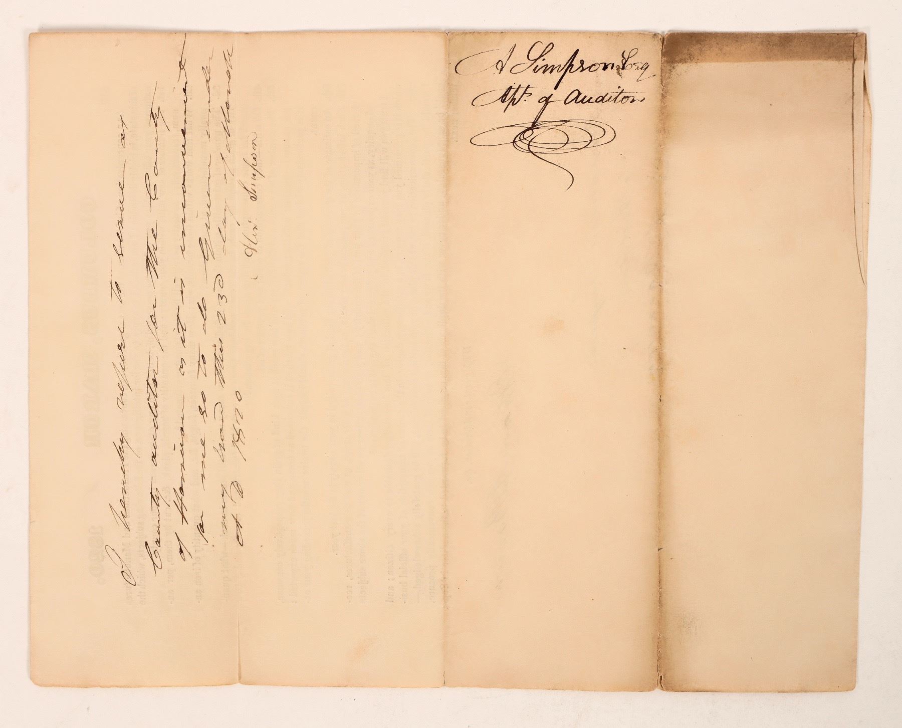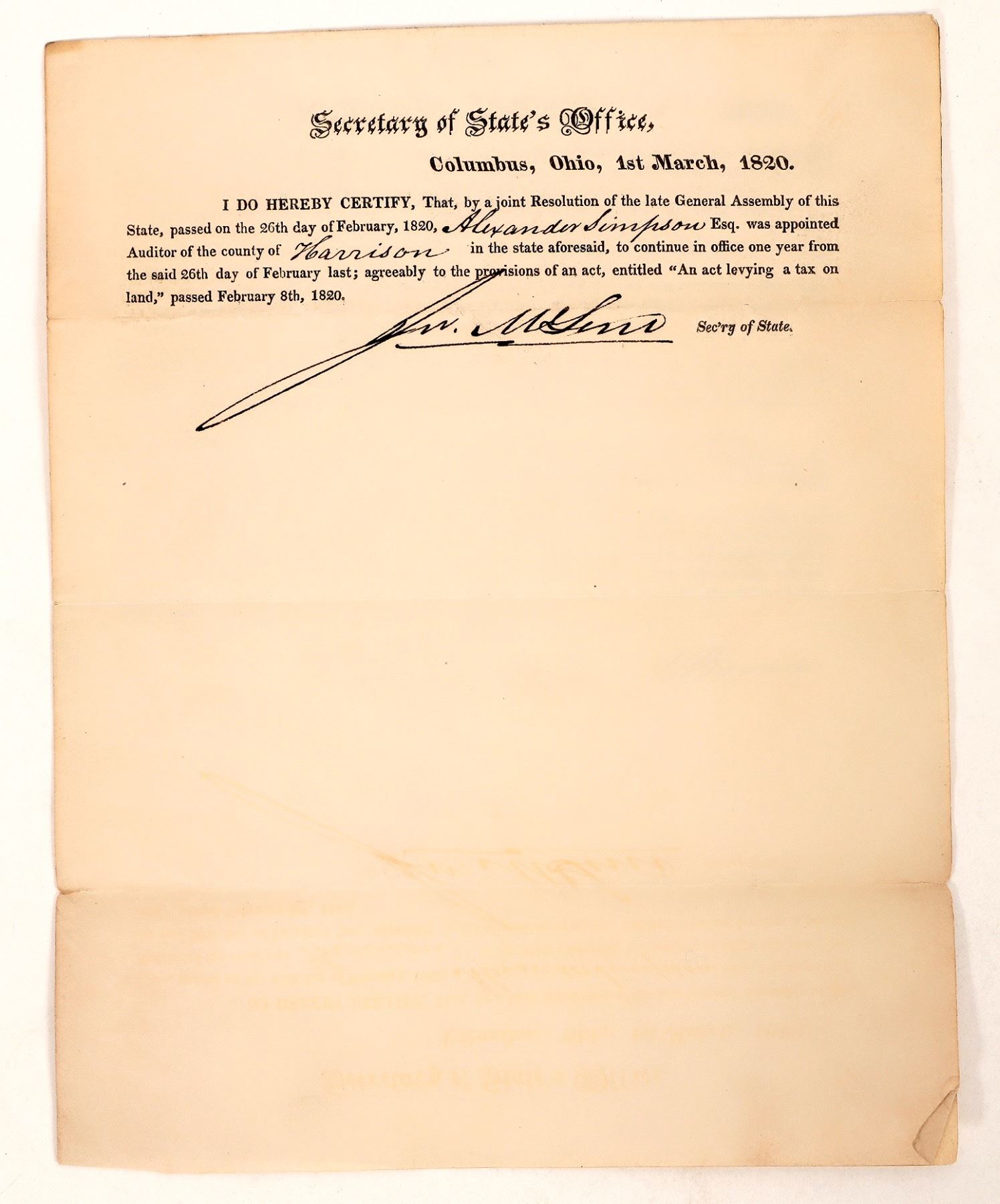 A printed 1820 document from the Ohio Secretary of State's office signed by Ethan Allen Brown, an Ohio politician who served as the state's seventh governor as well as serving a term as senator. He was also the Ohio Presidential Elector for Andrew Jackson. The document itself is a request for information regarding Ohio farming. It has minor tearing on the edges but is in overall good condition. [ Columbus Ohio