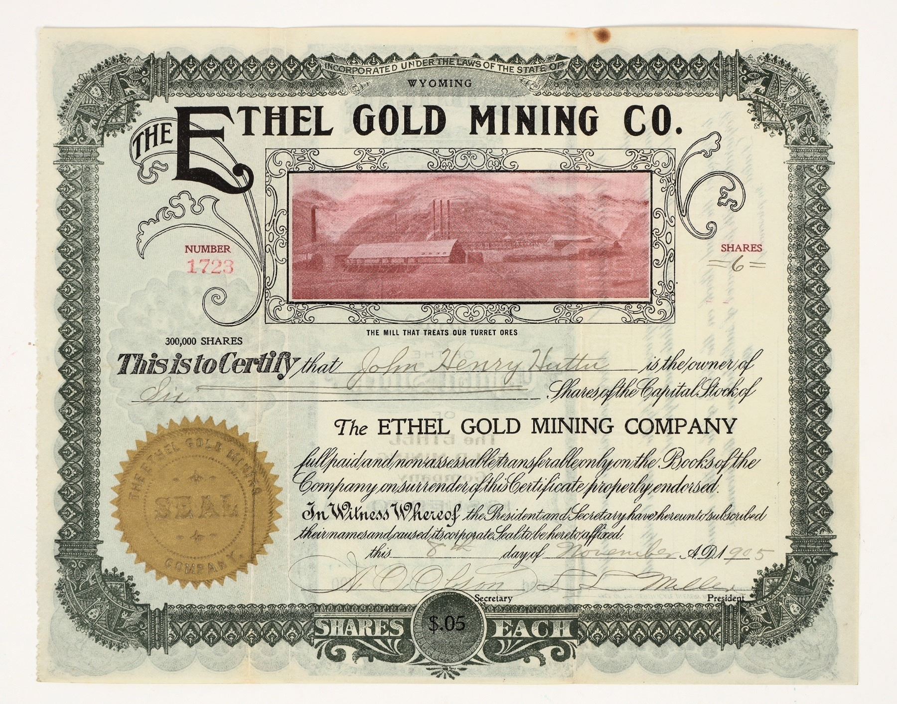 Inc. in Wyoming. No. 1723, issued for 6 shares in 1905. Signed by president LL Miller and secretary Olson. Not cancelled. Interesting design with photo vignette of "the mill that treats our Turret ores." Deep folds. Turret is a ghost town in Chafee County. We also found 1903 mentions of this company owning the Jim John mine at Yule Creek (Gunnison County).