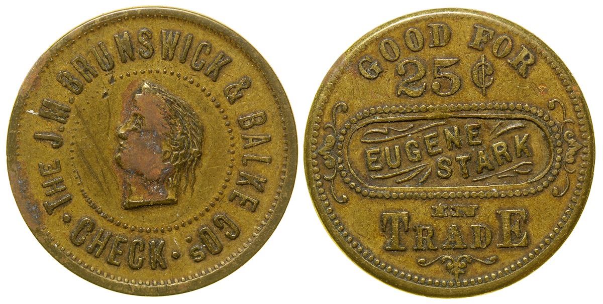 Obv.: Good For 25c / Eugene Stark / In / Trade; Rev.: The J.M. Brunswick & Balke Cos. Check. Rd., Br., 25mm, R-8. City: Virginia City State: Montana Date: ID: 37123