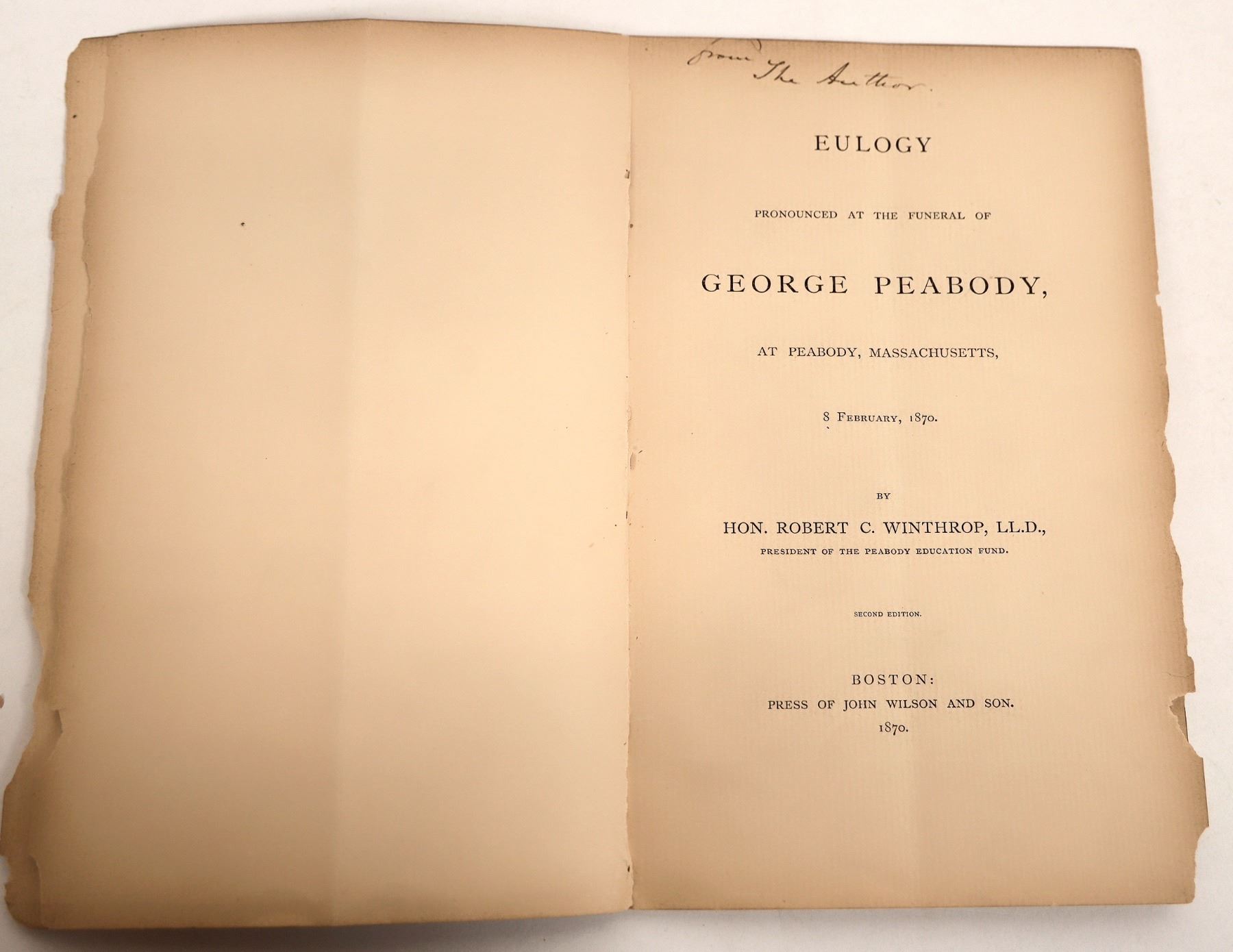This is the printed eulogy for banker and financier George Peabody by Robert C. Winthrop.