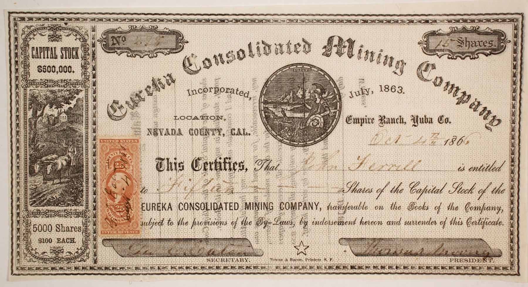 # 278 for 15 shares to John Ferrell. Signed by Thomas Mooney president and George Eaton. Dateline Empire Ranch, Yuba County 1866. Incorporated July 1863. 25c US Revenue Stamp. Rare and hard to find stock certificate. William Harris and John Farrell were in the clothing business and the two were instrumental in forming Grass Valley’s famous Cornish Choir. Prag Collection State: California City: Empire Ranch, Nevada County Date: 1866