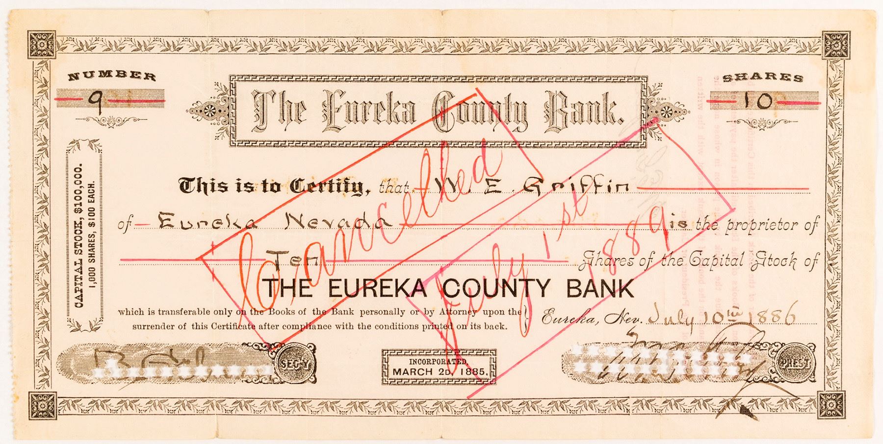 I/C 1886 to WE Griffin who was the exclusive Wells Fargo agent for Eureka and his signature is on the back. #9, 10 shares. Date: Location: Eurkea, Nevada HWAC # 54368
