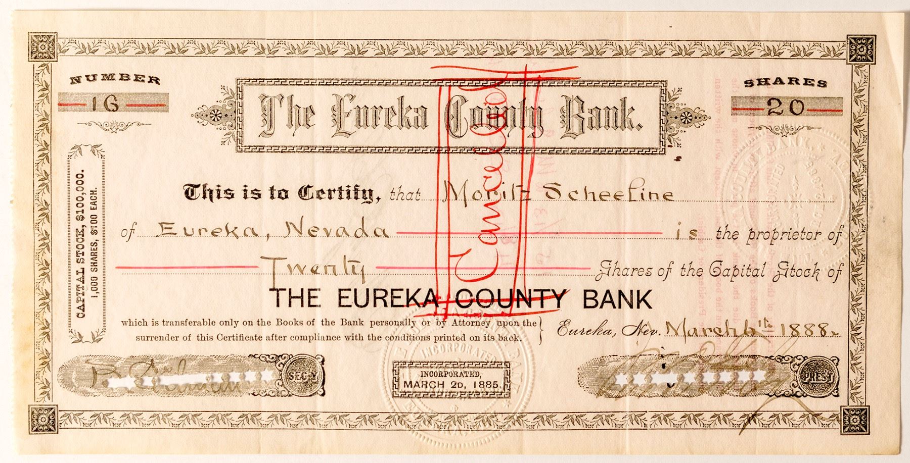 Rare. I/C 1888 to Moritz Scheeline, a Reno banker. #16 20 shares. 5" x 10 ". Date: Location: Eureka , Nevada HWAC # 54343