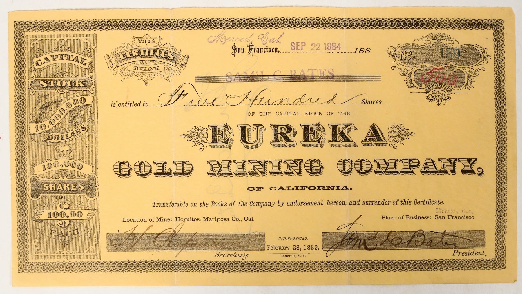 Eureka Gold Mining Company Stock Certificate, Hornitos, Mariposa County, CA, 1884 [197926]